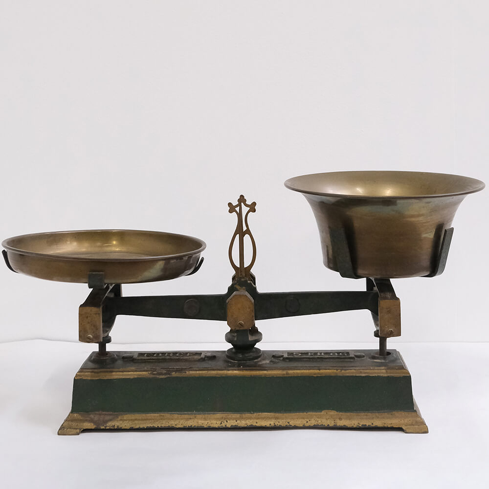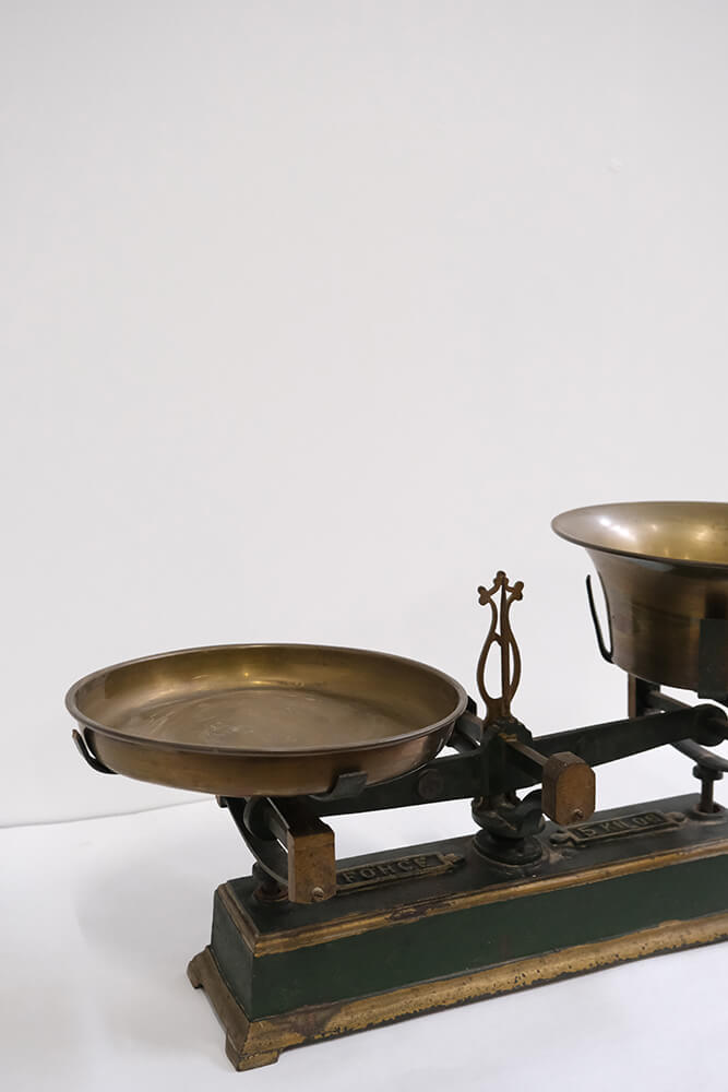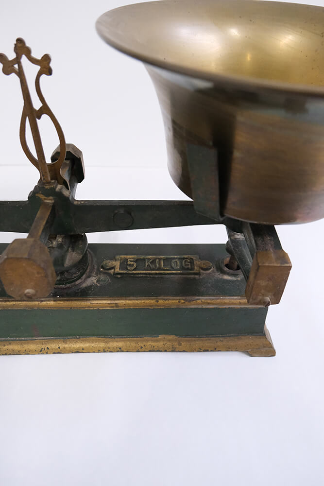 Step back in time with this large and beautiful table scale. This vintage find, with its sturdy construction and fascinating patina, is a decorative time capsule that adds charm to any decor. Perfect for those in need of an eye-catching centerpiece in the shop, café, or home.