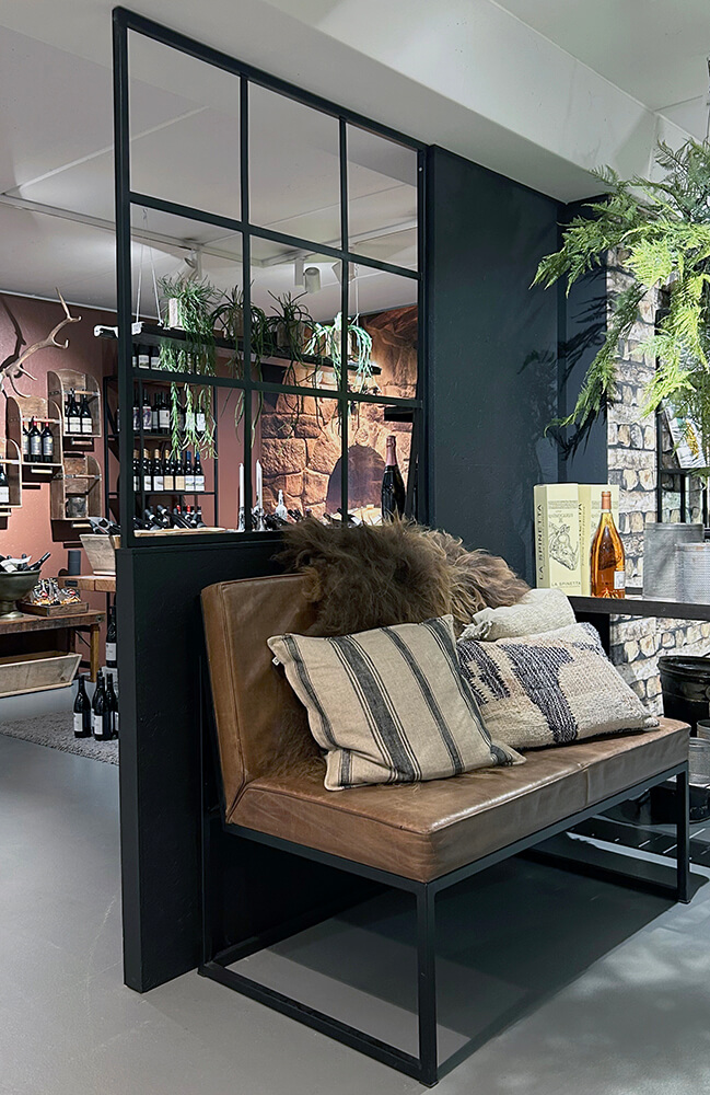 This square partition wall or window frame in black iron is designed in the classic New York style with 9 sections. It is delivered WITHOUT glass, giving you the freedom to use the frame in multiple ways, as a pure room divider, a decorative wall frame, or a creative element in your interior. The open construction adds a raw, industrial expression while still maintaining a sense of lightness in the room. Perfect for the home, office, or café. Comes without fittings. We recommend consulting a carpenter to find the right mounting solution.