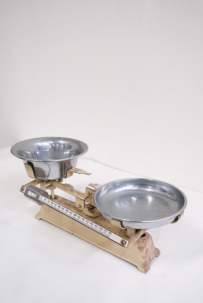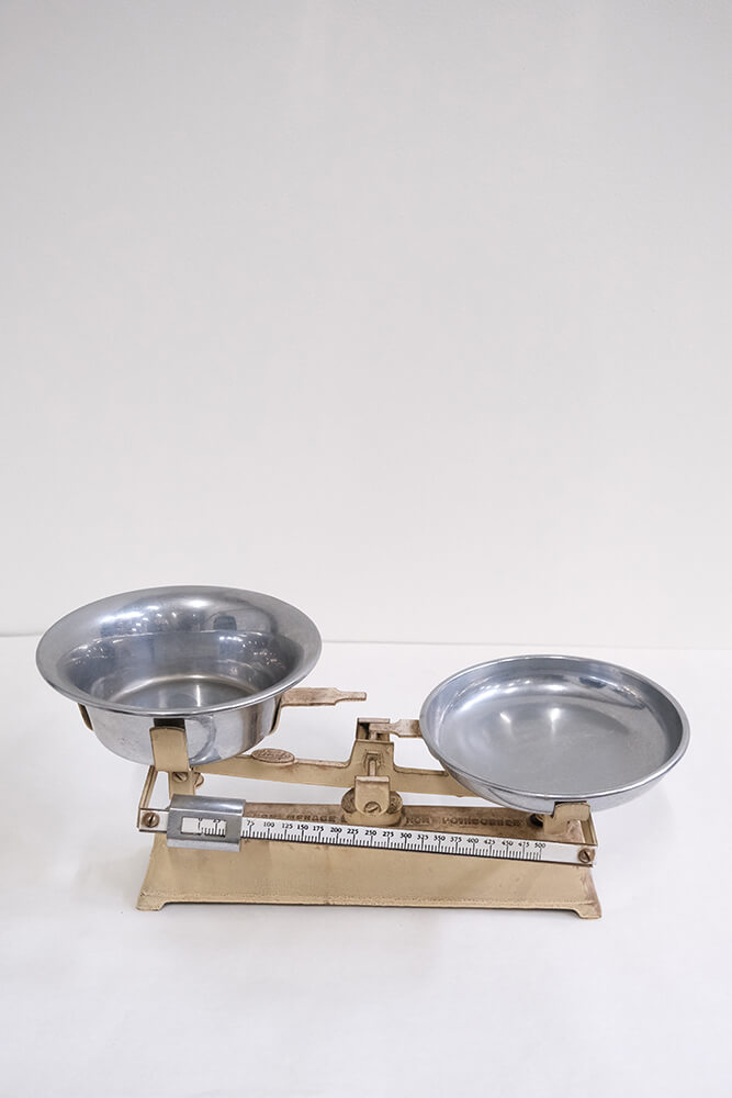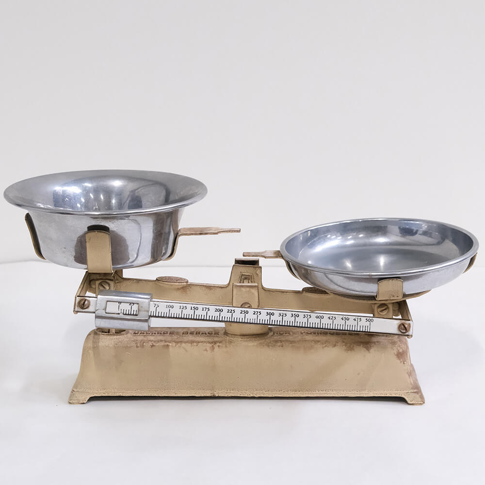 Beautiful old balance scale in iron with two removable iron bowls. The beige base and shiny bowls give the scale a timeless look, perfect as decoration in the kitchen, on a shelf, or in a shop setting. An authentic vintage find with both function and aesthetics.
