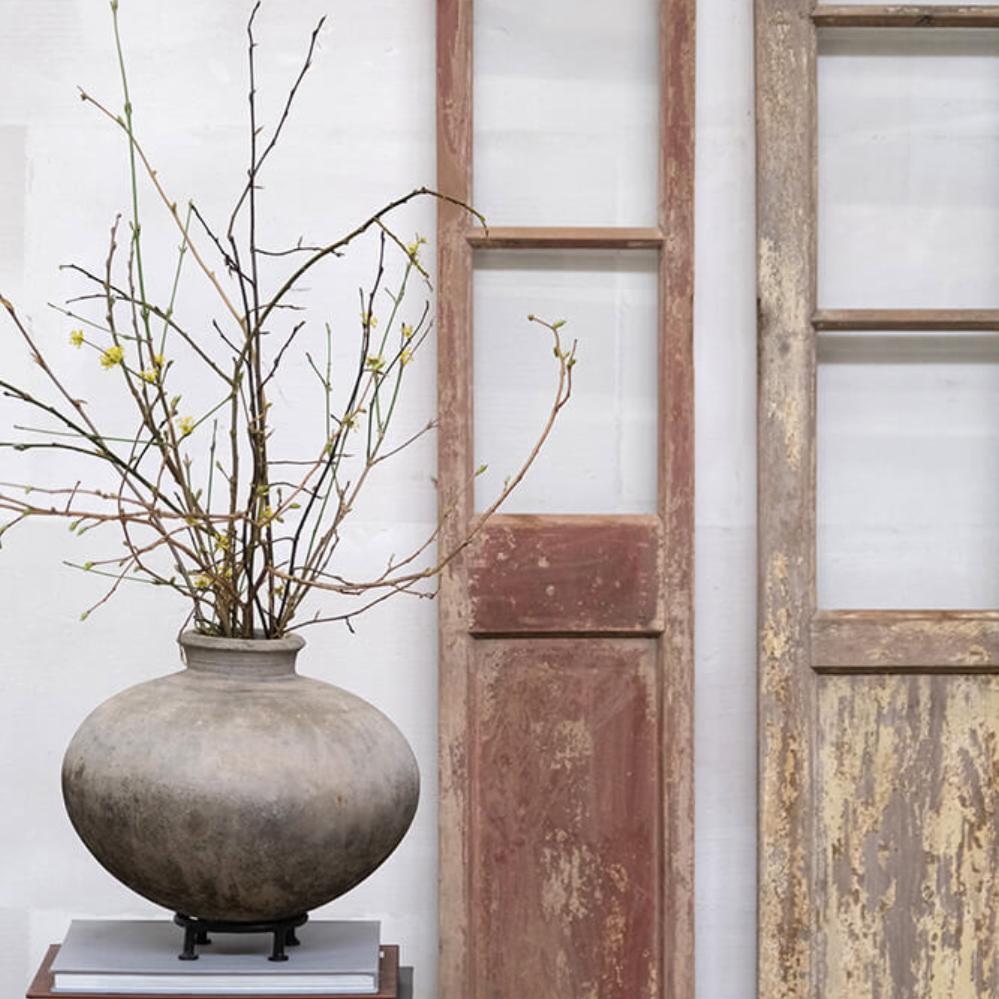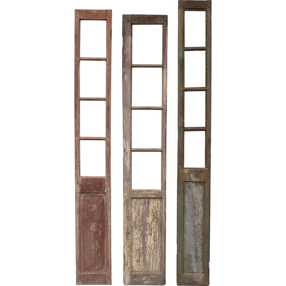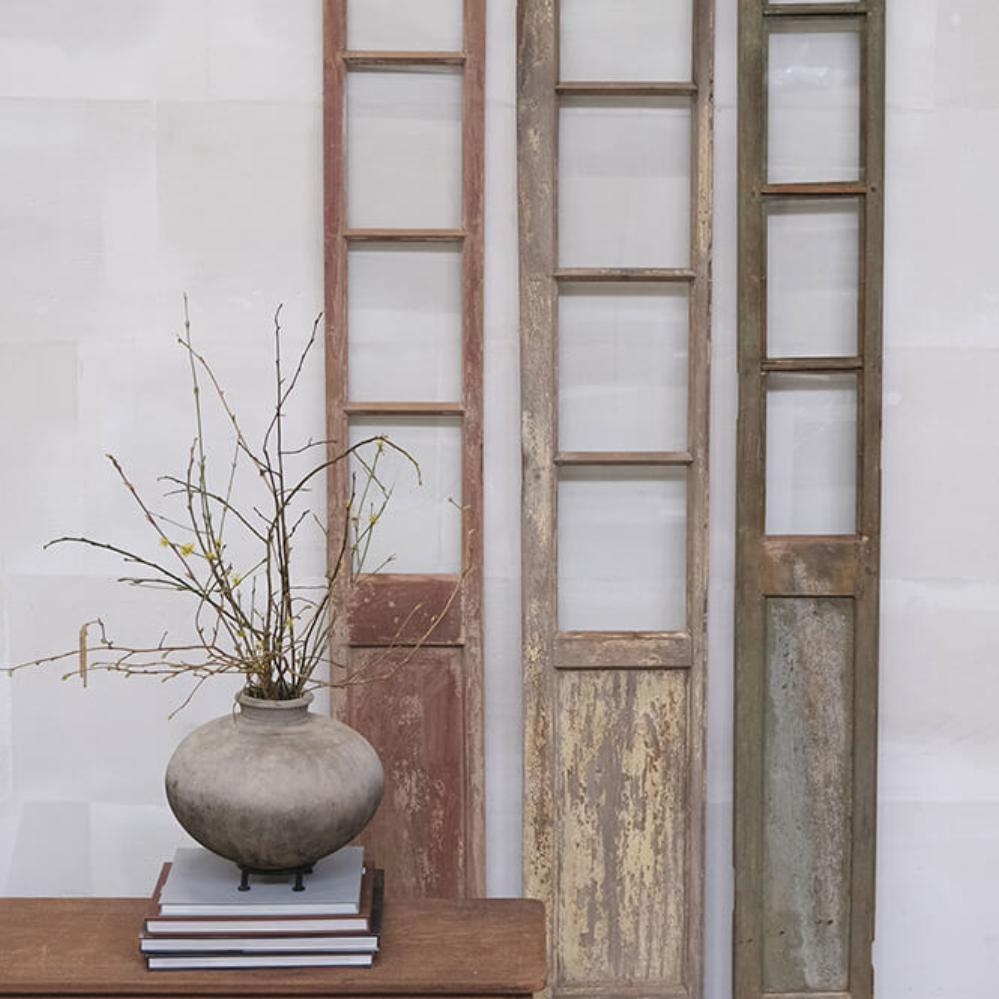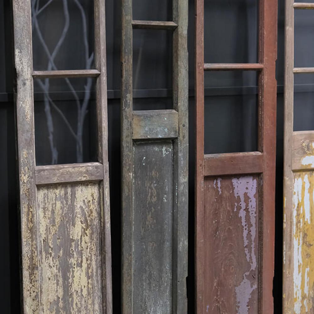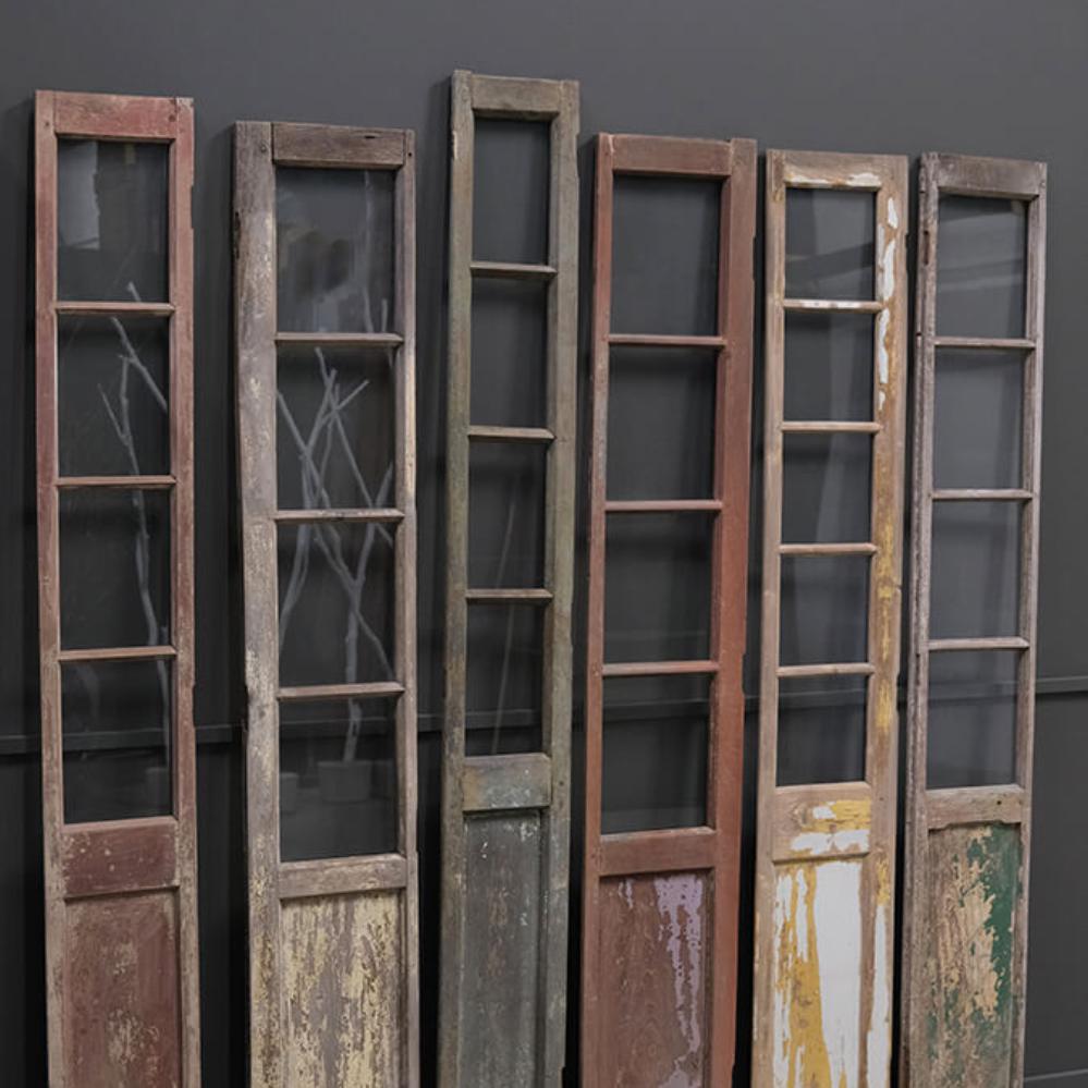 These charming door panels with glass panes carry a history that can be felt in their weathered surface and patinated paint. The slender frames and small glass sections create a light and airy look, while the raw wood structure and peeling paint add a rustic and authentic atmosphere. The door panels are perfect as decorative elements in your interior, whether used as an eyecatcher in a shop, restaurant, or as a statement piece in a home. They can also be incorporated into a creative upcycling project – the possibilities are endless with their timeless charm and story. Bring a piece of old craftsmanship into your space and let these door panels tell their own tale.