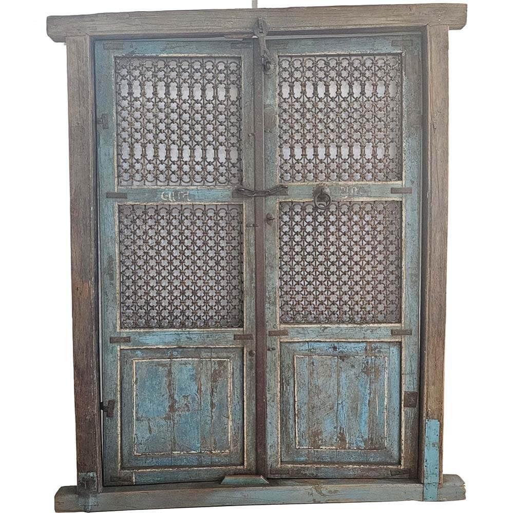 This beautiful old door exudes character and history. Its wooden frame in patinated blue and natural tones is combined with a detailed iron grille that gives the door a unique expression. The grille adds an industrial touch, while the worn wood finish creates warmth and charm. This door is functional and a statement piece, perfect as wall decoration, a decorative divider, or part of a larger project with reused materials. An old wooden door that truly tells its own story.