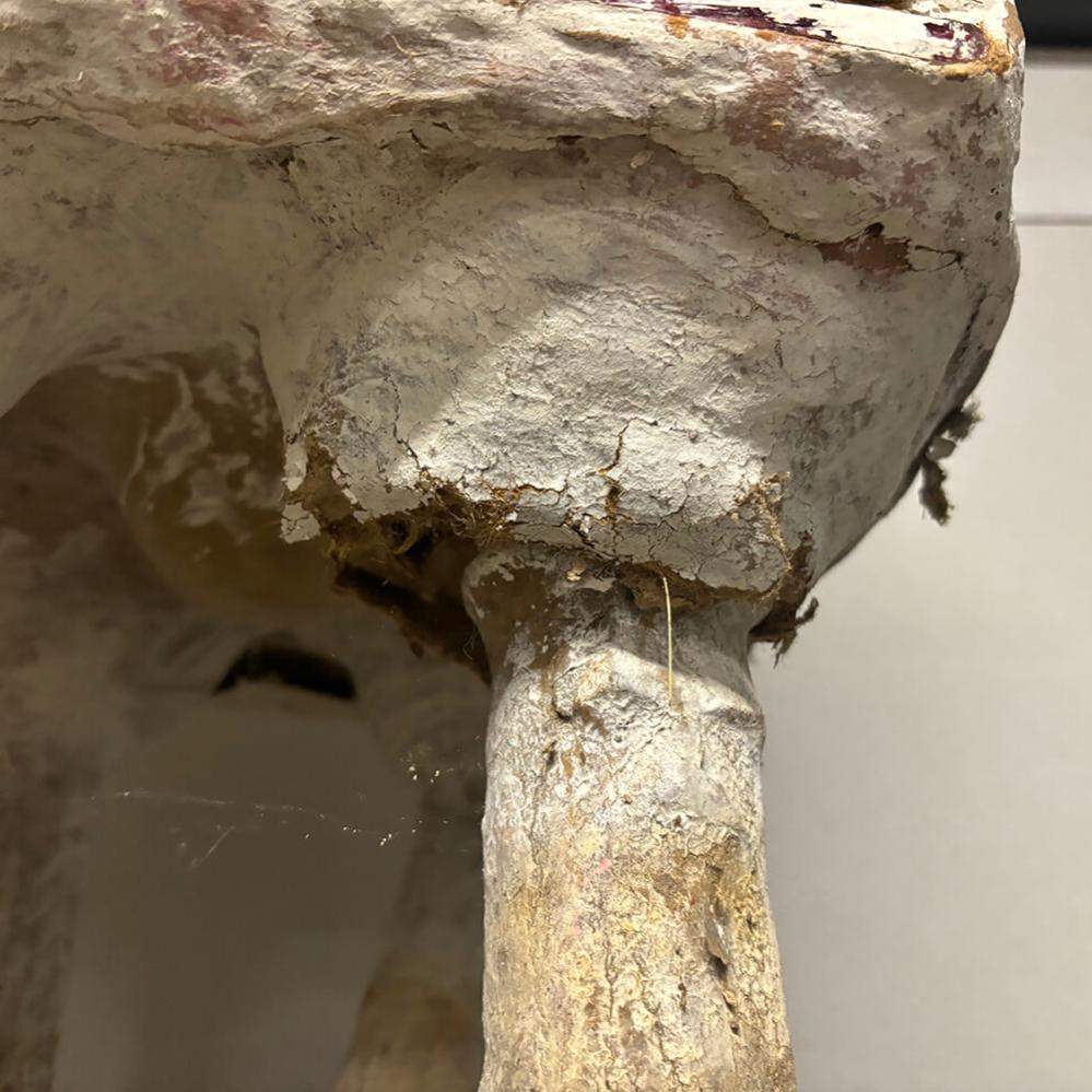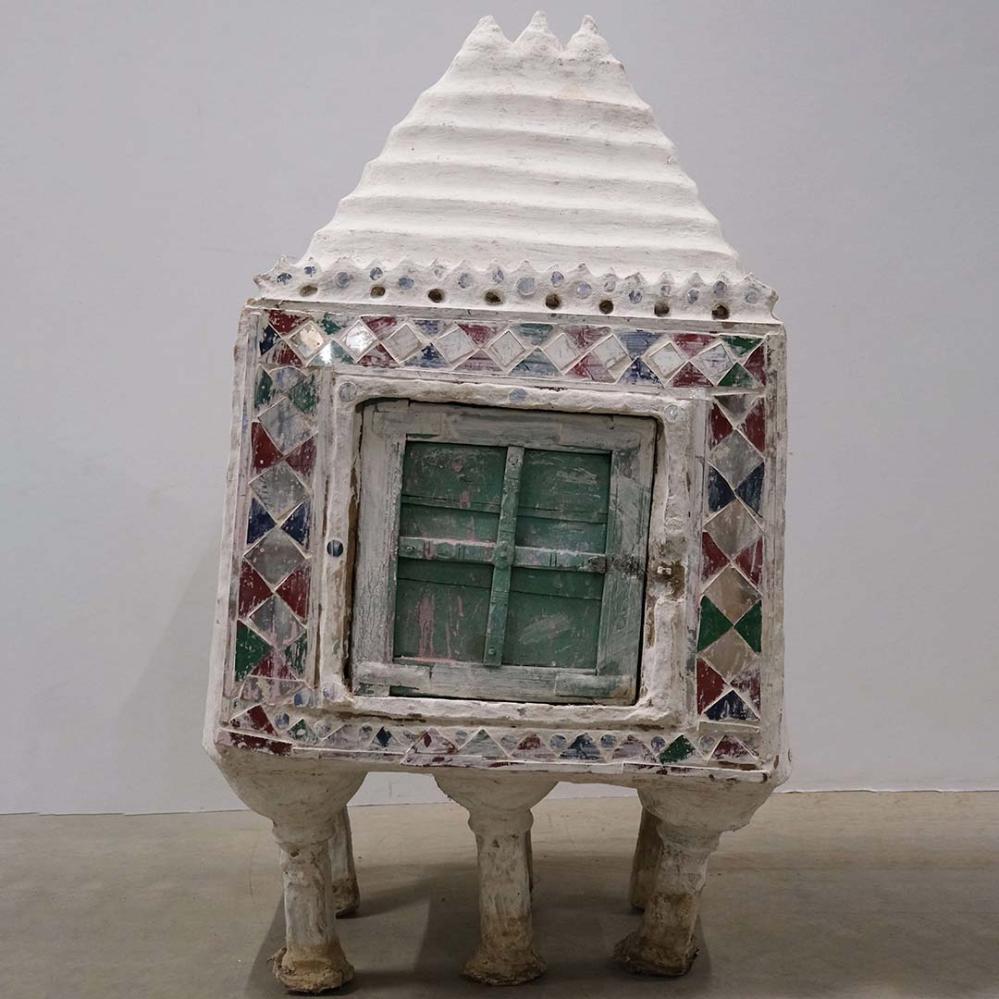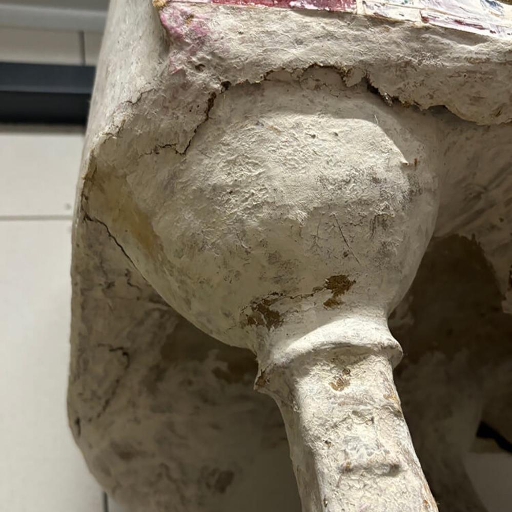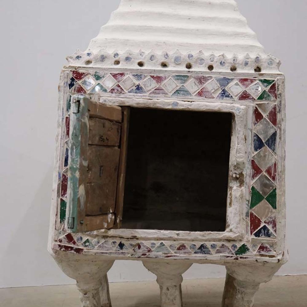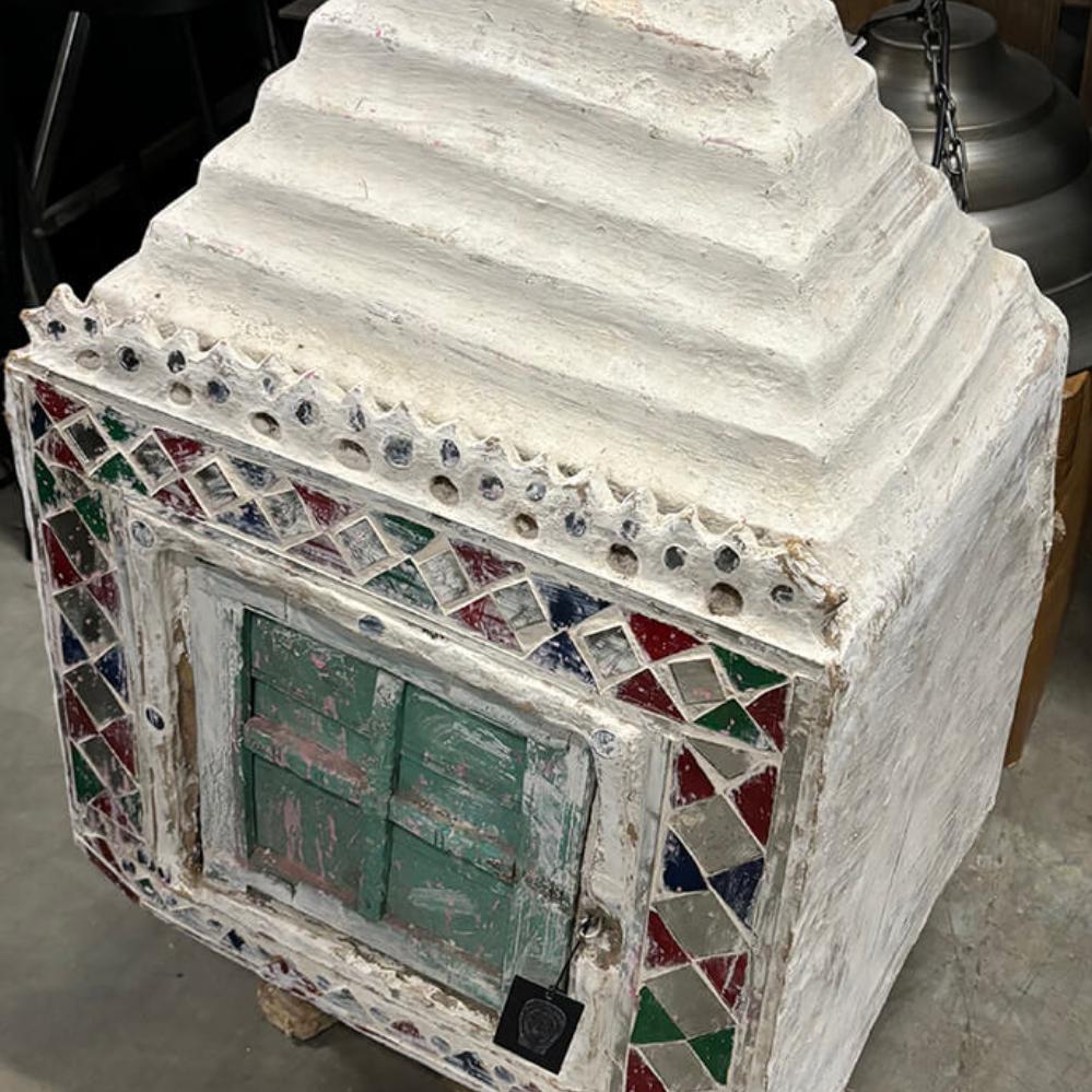 This small Indian temple made of Papier-Mâché was originally used as a storage cabinet for food. Ideal for this purpose, as it kept both small insects and heat out. It is a piece of unique art with fine details like carvings. When you open the small door in the front, you have access to the small cabinet . An obvious choice for you wants something no one else has. Papier-Mâché is a creative way to recycle old newspapers and magazines. The newspaper are torn to pieces and mixed with glue, after wich they are molded to figures when moist and then dried. NOTE: One of the three peaks on the top of the cabinet is missing its tip, and the legs and base are in poor condition.