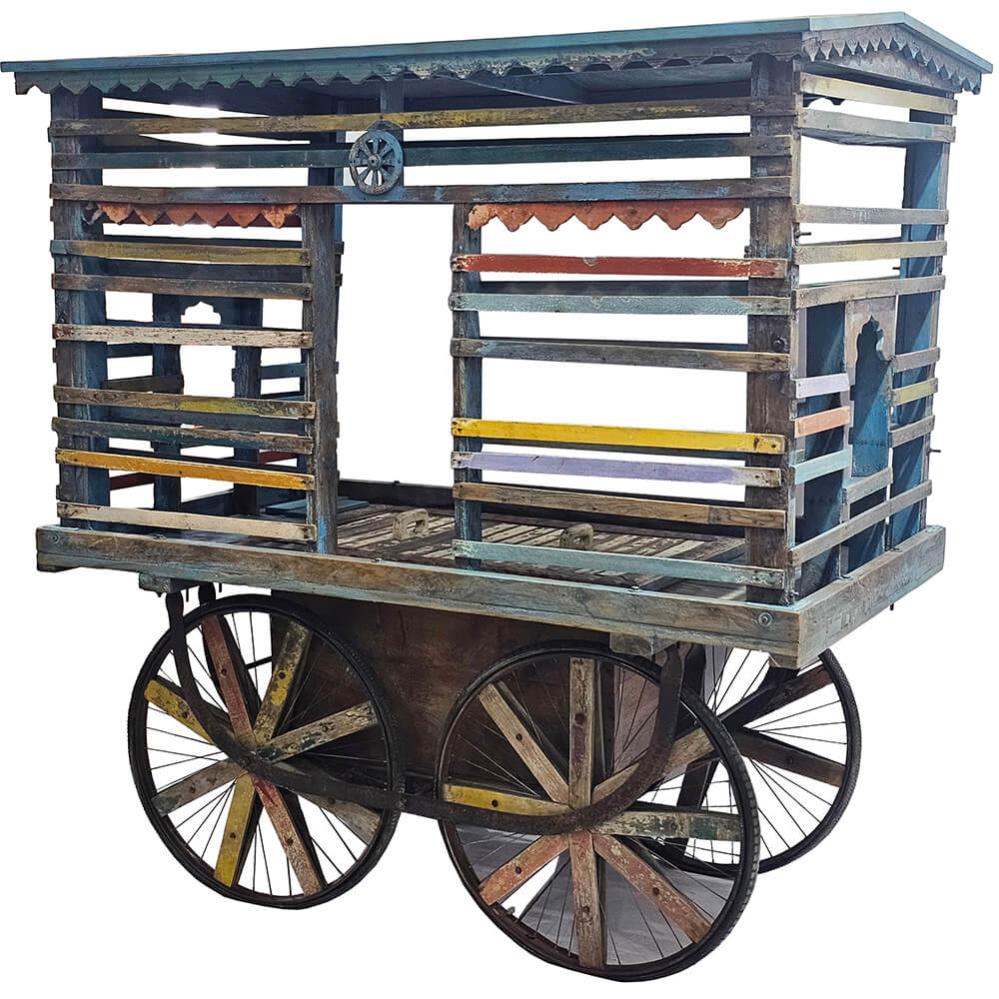 This old Indian ice cream cart is an authentic gem that exudes history and charm. The cart features wheels and a frame with rustic patina, while colorful details and worn wooden slats tell stories of its vibrant past on Indian streets. With its quirky design and character, it’s perfect as an eye-catching centerpiece in a shop or café. Use it as a decorative display cart or as a fun and unique detail that brings an exotic vibe to any space.