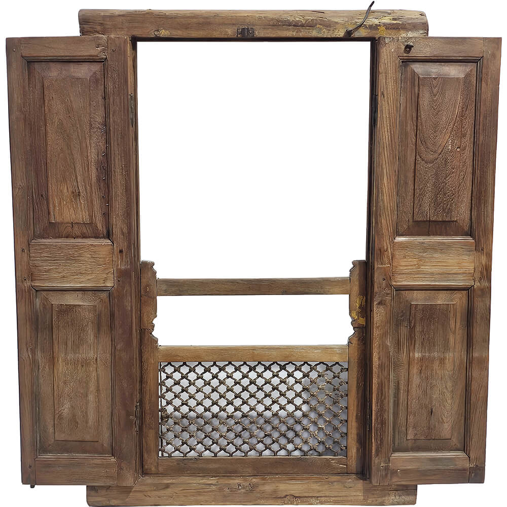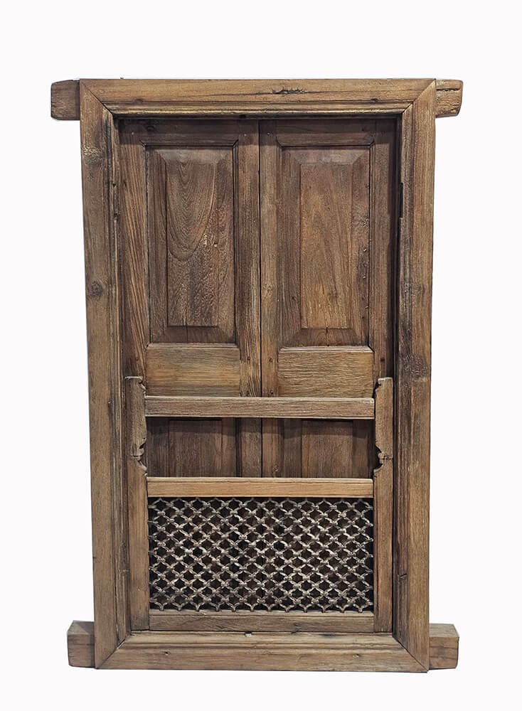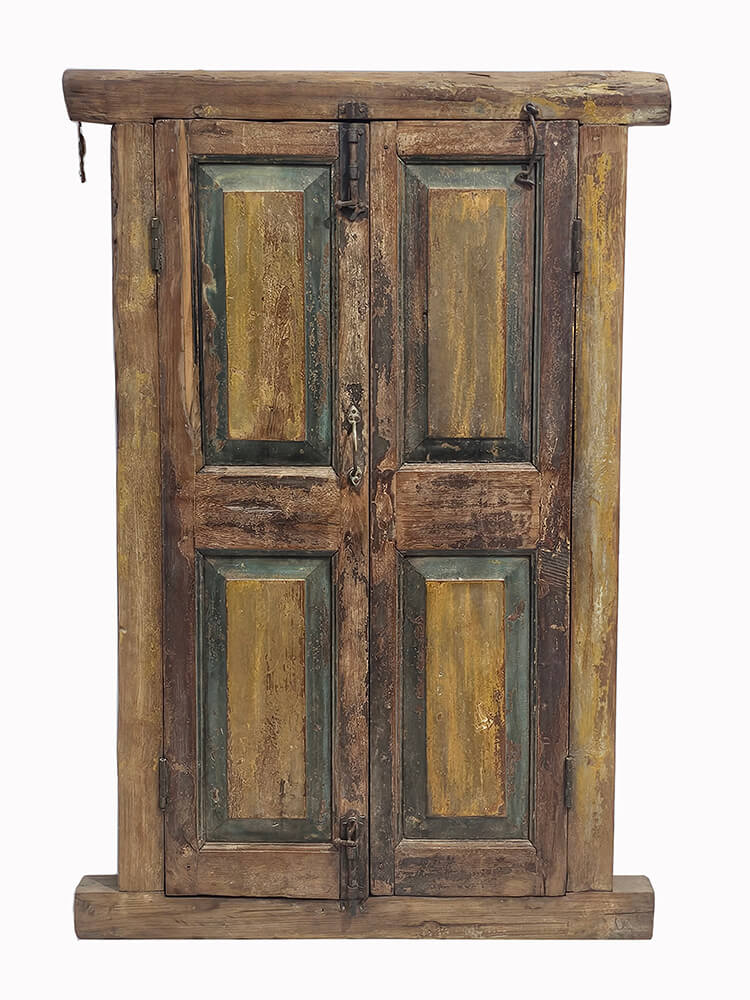 These old shutters with doors are an atmospheric and characterful element that bears clear traces of time and craftsmanship. The wood has a beautiful, warm patina with layers of worn colour, where shades of golden tones, muted green, and natural wood interact to create a lively expression. The two doors feature panels and original details such as hinges and fittings, underlining the window section’s authentic origin. The solid frame and raw surfaces tell a story of previous use, giving each mark and irregularity its own charm. The shutters are ideal as decorative wall art, as a room divider, or as a creative feature in private homes, shop interiors, or café settings.