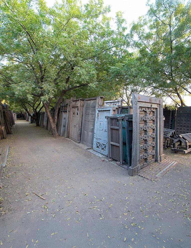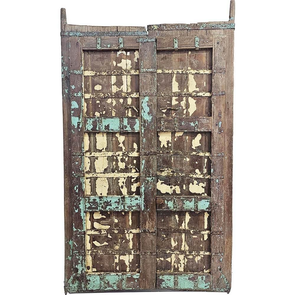 This impressive old door still carries traces of its original pastel-colored paint in light yellow and blue tones. Wear, cracks, and rusty metal fittings reveal a history of many years of use. It is the perfect choice for you who love authentic vintage style and want to add a touch of soul and charm to your interior.