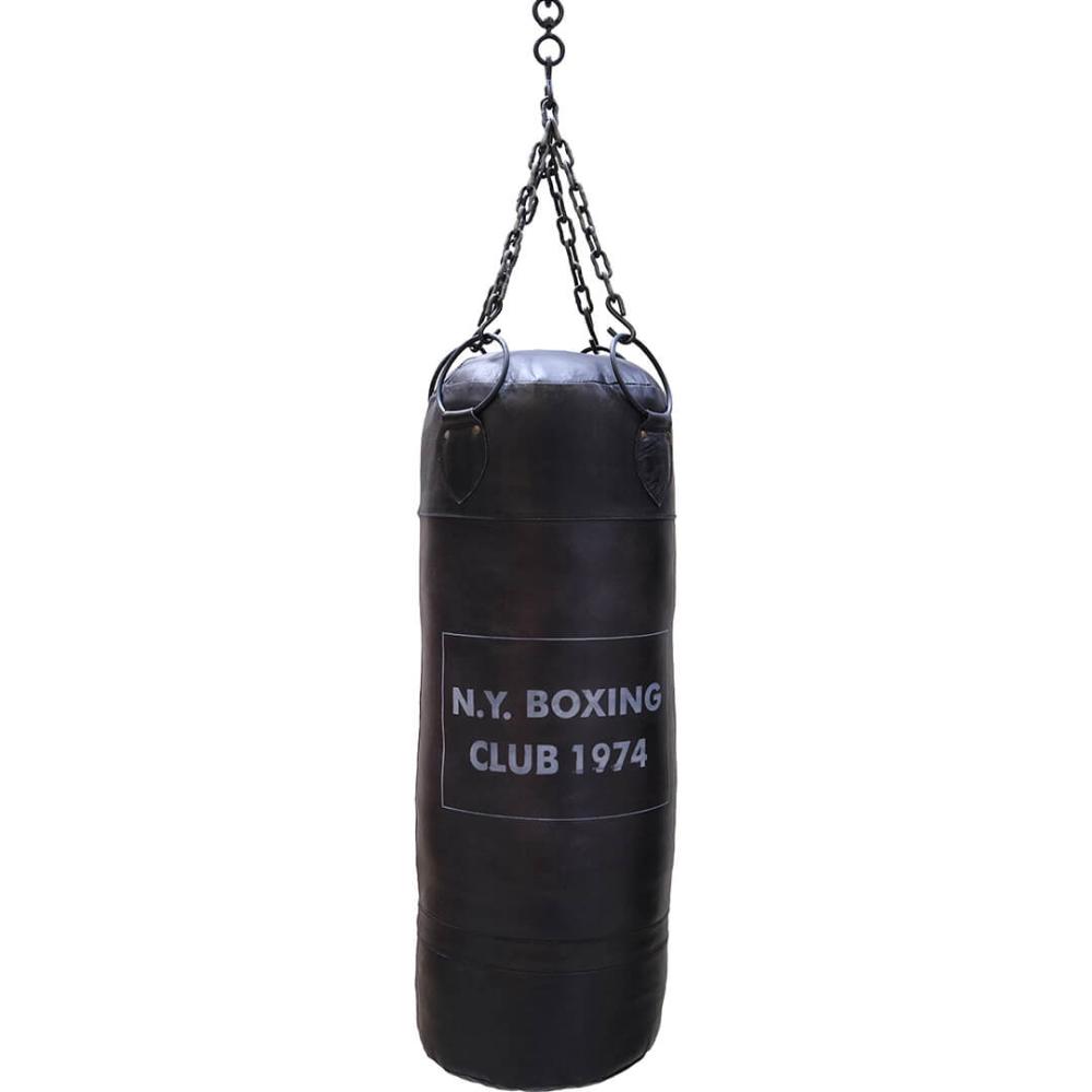 This large punching bag is a decorative piece that adds a bold, authentic edge to any space. Made of black leather and equipped with sturdy iron chains for hanging, it instantly evokes the atmosphere of classic boxing clubs. The bag is filled with recycled cotton and intended for decoration only, it is not suitable for training. The printed text N.Y. Boxing Club 1974 enhances the raw vintage look, making it ideal for cafés, shops, masculine interiors, or a true “man cave” setting.