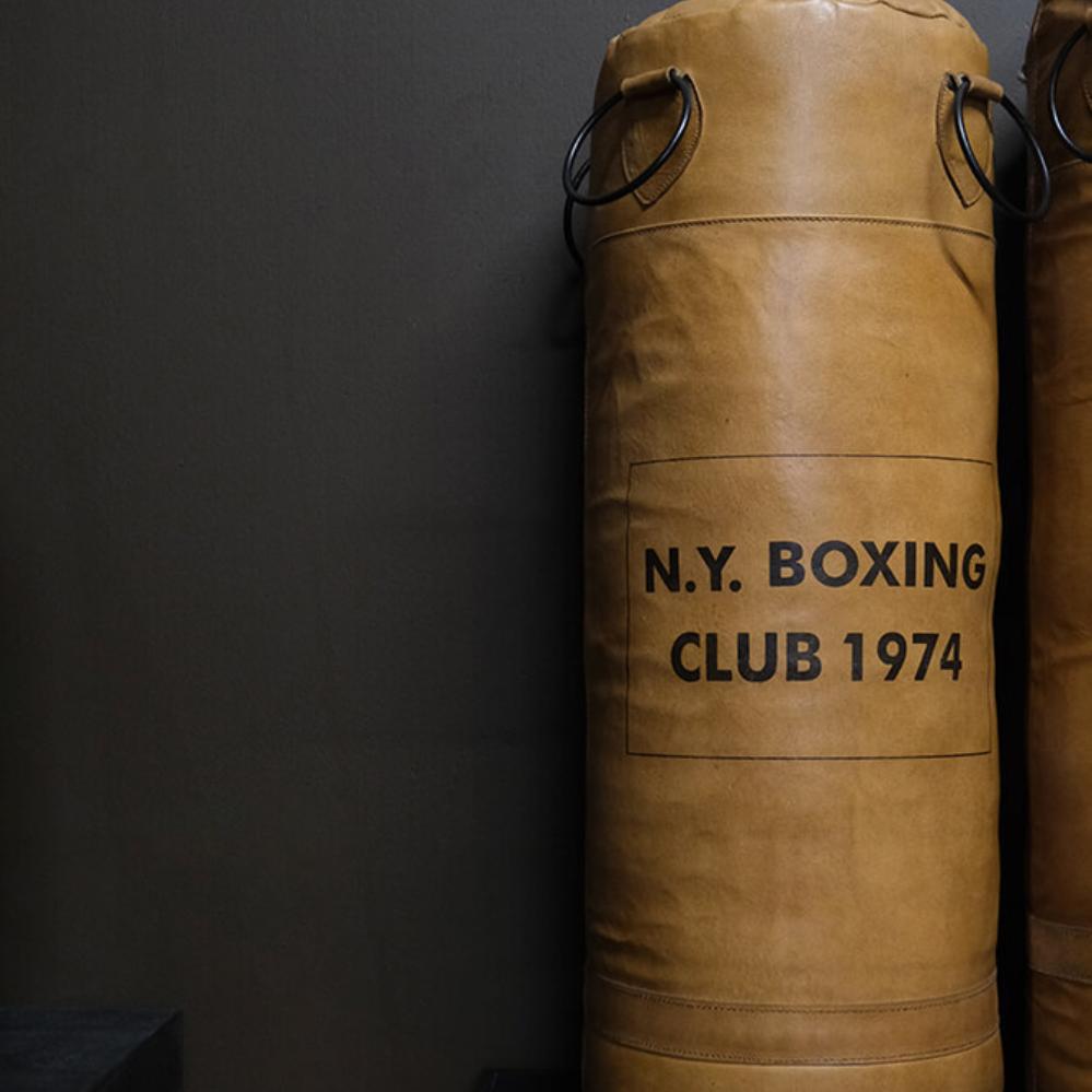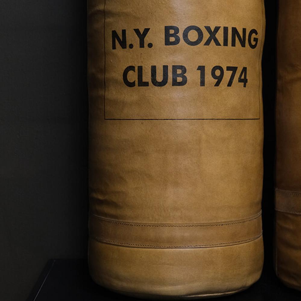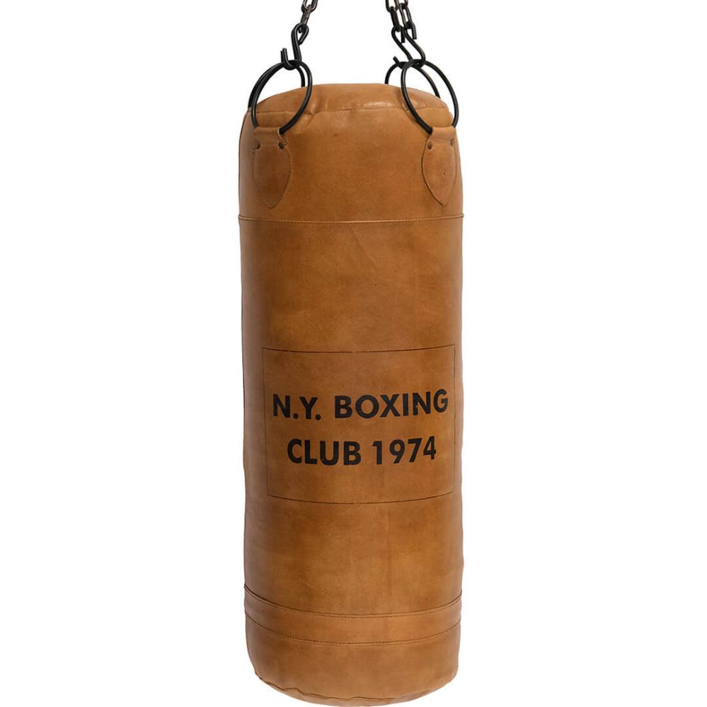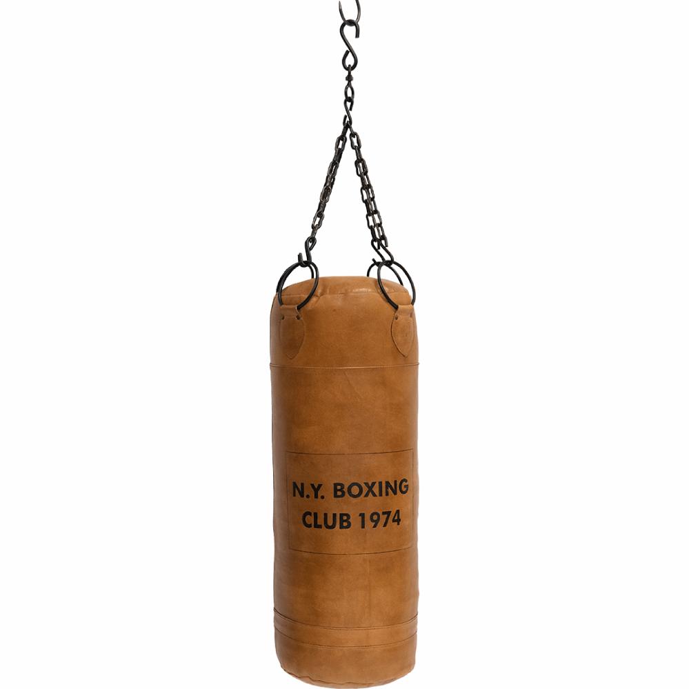 This decorative punching bag in brown leather makes a striking statement and adds a cool, characterful detail to your interior. Hanging from heavy iron chains and carrying the print N.Y. Boxing Club 1974, it brings an extra nod to sporting history. The bag is filled with recycled cotton but is solely meant for decoration. It works perfectly as an unconventional element in a café, shop, or home where a raw and atmospheric vibe is desired.