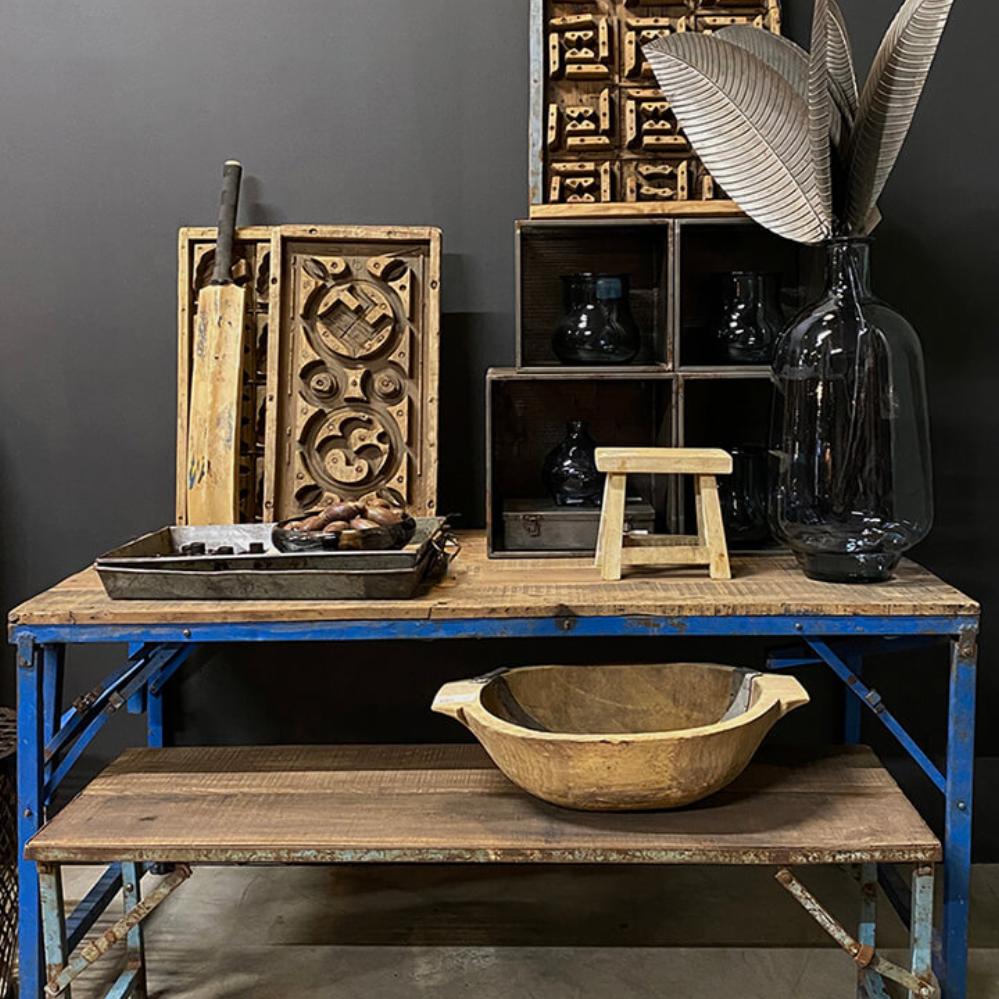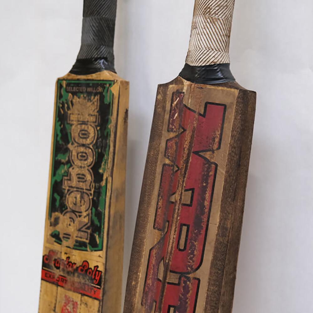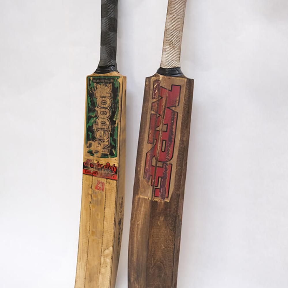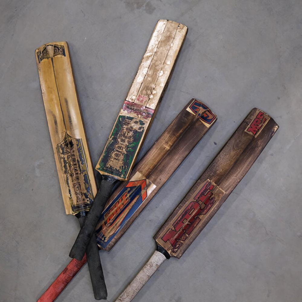 Old cricket bat in wood with different prints. All bats are unique both in size and look. Cricket is played all over the world but is in particular a popular sport in India.