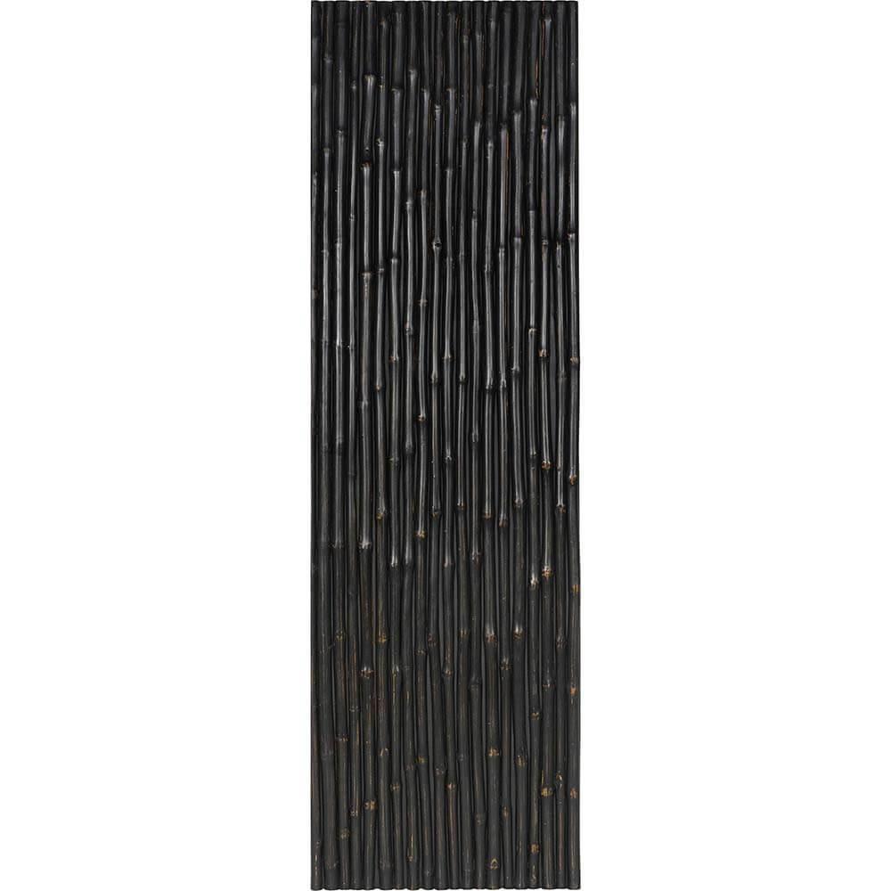 This wall panel is covered with black bamboo sticks, giving it a graphic and dramatic look. The dark bamboo sticks are halved and placed closely together, creating a stylish structure with a modern touch. Despite the color, the natural texture and irregularities of the bamboo are still visible, creating an interesting visual play of light and shadow. This wall panel is perfect for an interior that seeks a minimalist yet exotic and refined depth in the decor. The black color makes it suitable for both modern and industrial environments, where it can function as a feature wall or decorative panel.