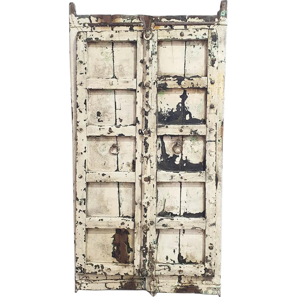 This white, old wooden door is a true gem for anyone who loves furniture and interiors with history and character. The door bears clear signs of wear and use, which only enhance its charm. The paint is chipped in several places, revealing layers of earlier colours, all contributing to a wonderfully vibrant patina. The small iron rings, decorative fittings, and bold wooden frames tell the story of a piece of craftsmanship that was once both functional and meaningful. Today, this door can be used as a unique wall decoration, a backdrop in a shop, a bold statement in an entryway, or a creative room divider, or simply as what it is: a door full of personality. Every scratch and chip is a chapter in its story. Ready to write the next one with you.