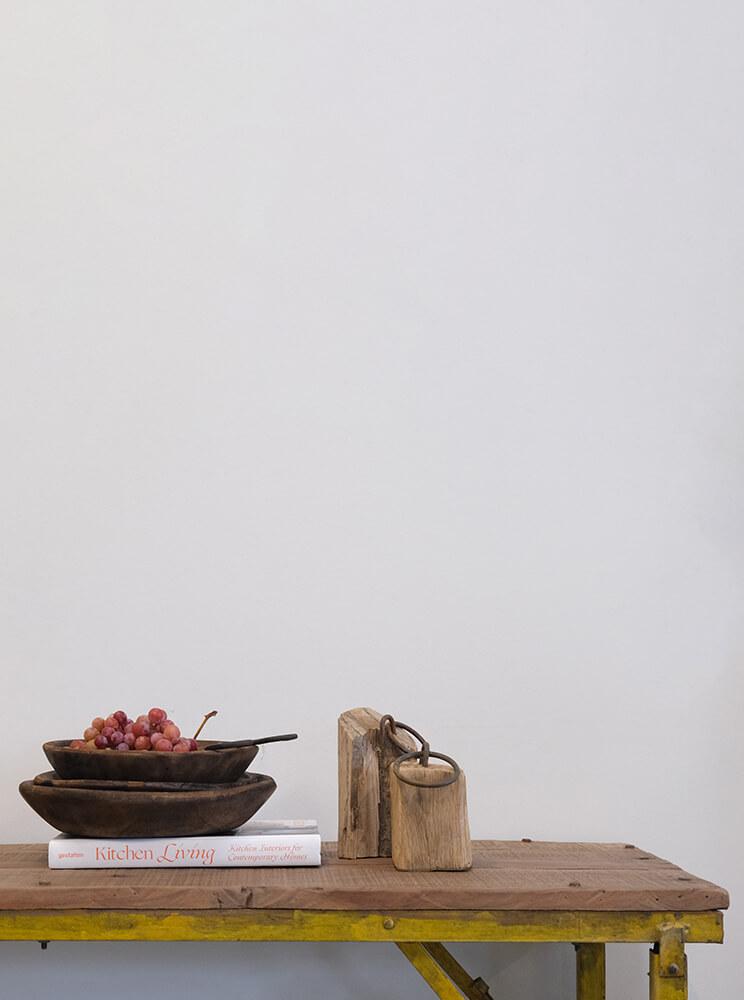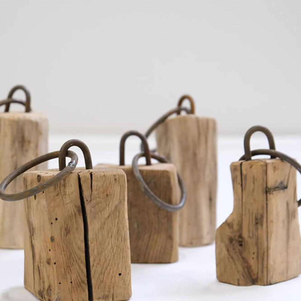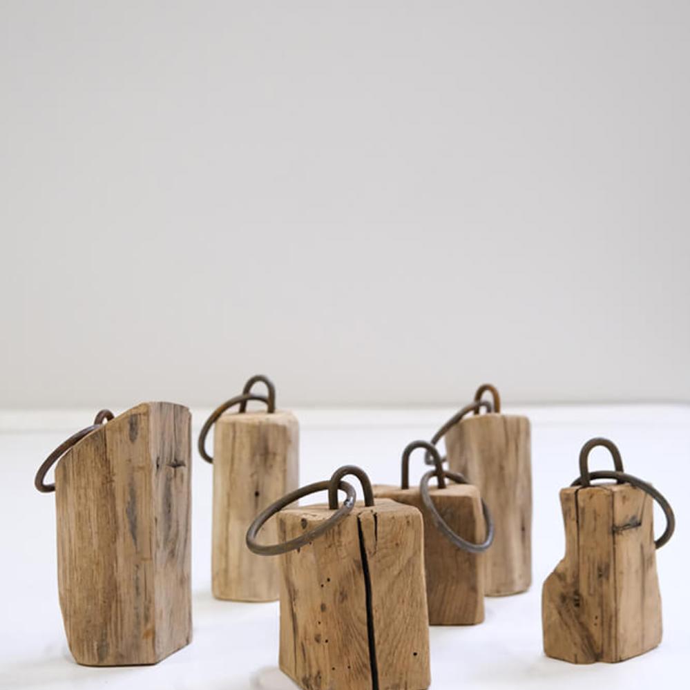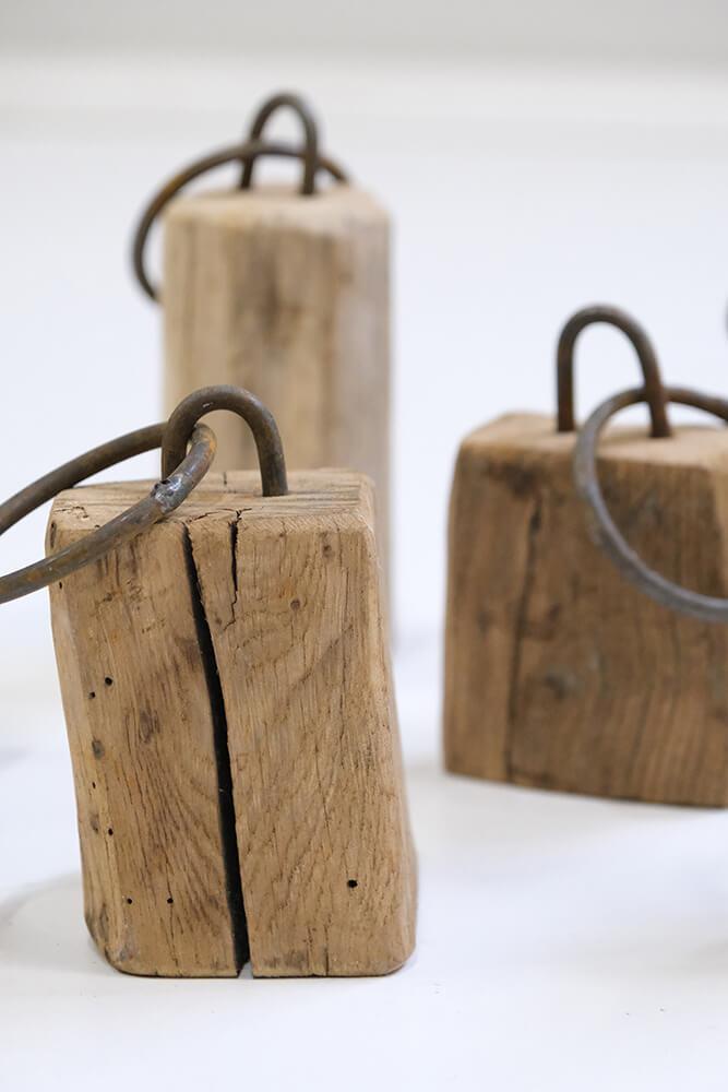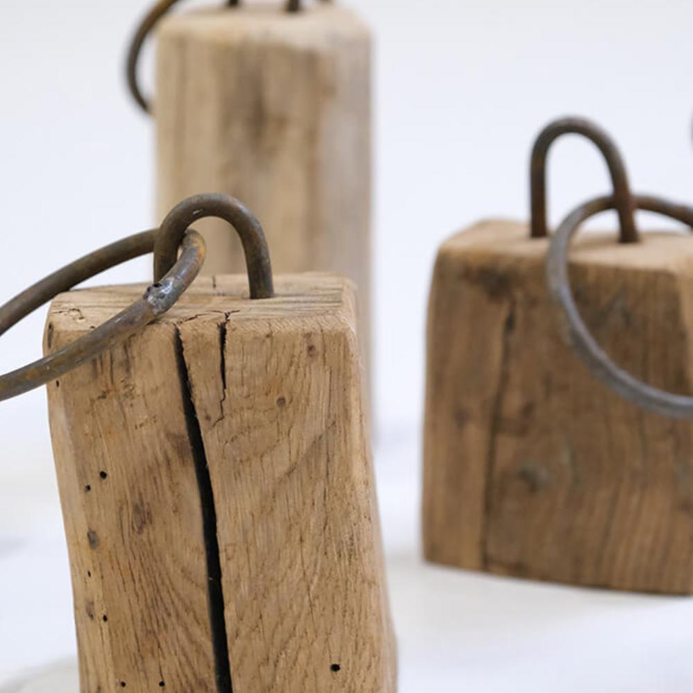 These decorative wooden blocks are anything but uniform, and that is exactly their charm. Each block is carved from reclaimed wood and bears its own marks of time, wear, and history. They vary greatly in size and shape, creating a lively and rustic look when placed together. The small iron fittings and rings emphasize the raw character of the blocks and make them perfect details in an interior where personality and edge are in focus. Use them as decorative elements on a shelf, on the floor, or in a shop display, where they can serve as both eye-catchers and conversation starters. None of the blocks are alike, making each one a unique piece that brings warmth and authenticity into your interior.