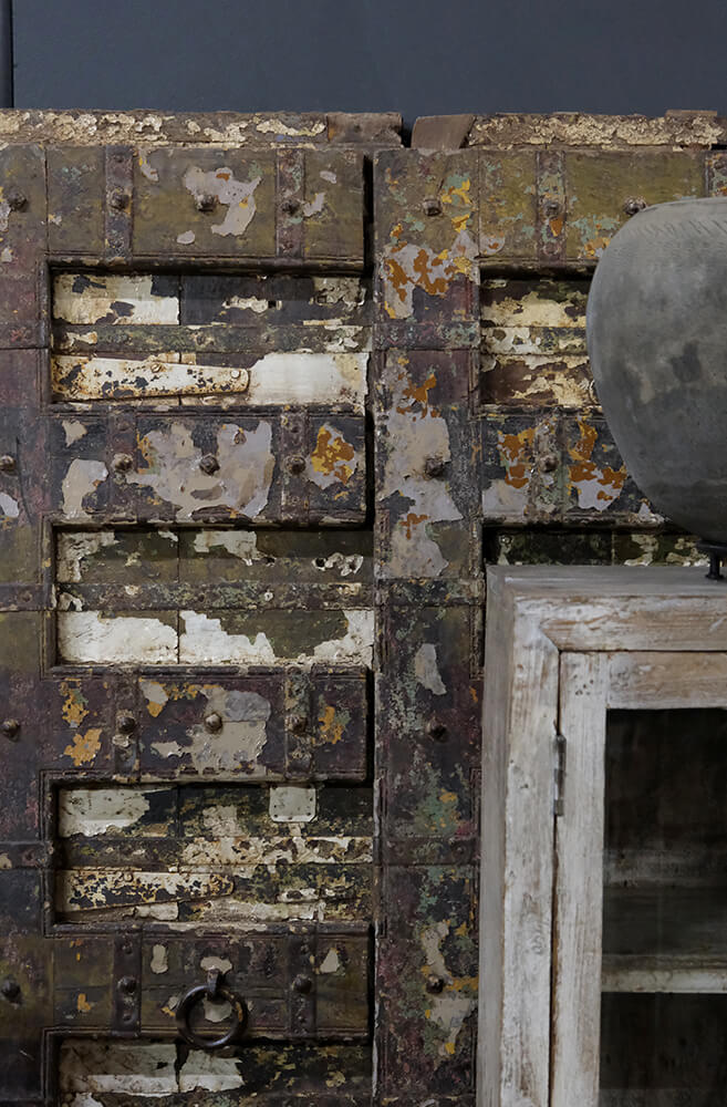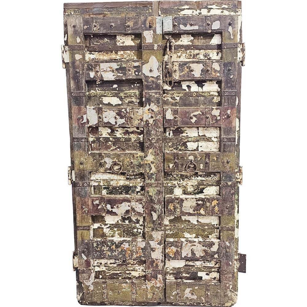 A stunning old wooden door where the passage of time has created a raw and unique expression. The chipped white and yellow paint remnants reveal layers of history, while the sturdy iron reinforcements add an authentic rustic touch. This door will make a bold statement in any interior – use it as an artistic wall decoration, a room divider, or a striking entrance that exudes patina and personality.