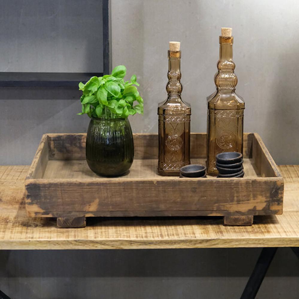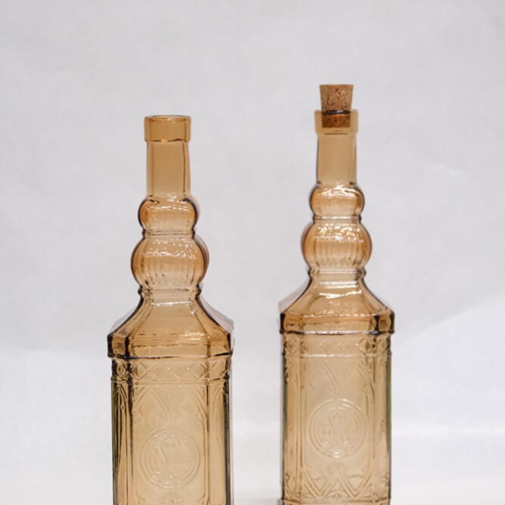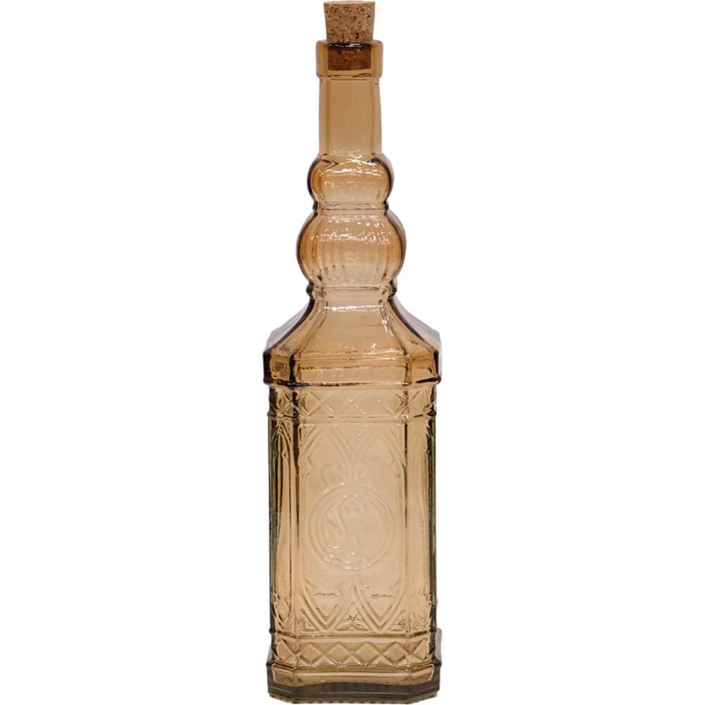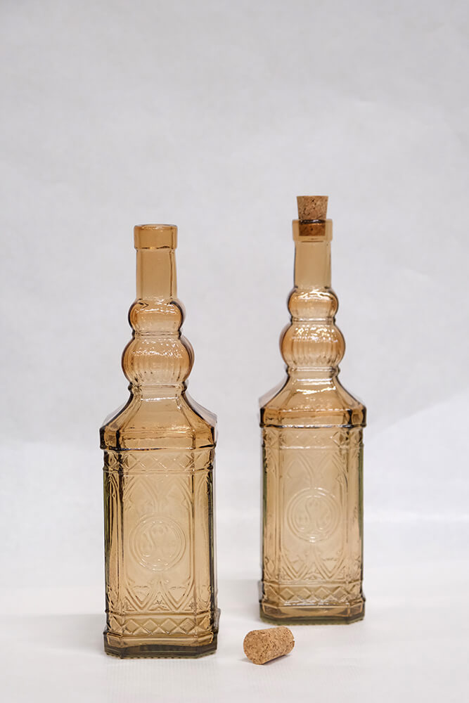 This beautiful glass bottle combines style and raw charm in one. Made from 100% recycled glass, it carries a unique character with small variations in the glass structure that make each piece one of a kind. The decorative pattern and classic cork stopper emphasise the vintage-inspired look, fitting nicely into both modern and rustic interiors. Use the bottle to serve water, wine, or juice in style, or let it decorate your shelf as a statement piece on its own. It also works beautifully as an alternative vase for a single stem or a few dried branches. The bottle is also available in a slightly smaller version, allowing you to create a matching set – perfect for adding a personal touch to your table or shelf. The glass bottle holds 700 ml.