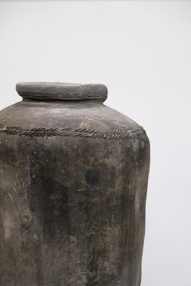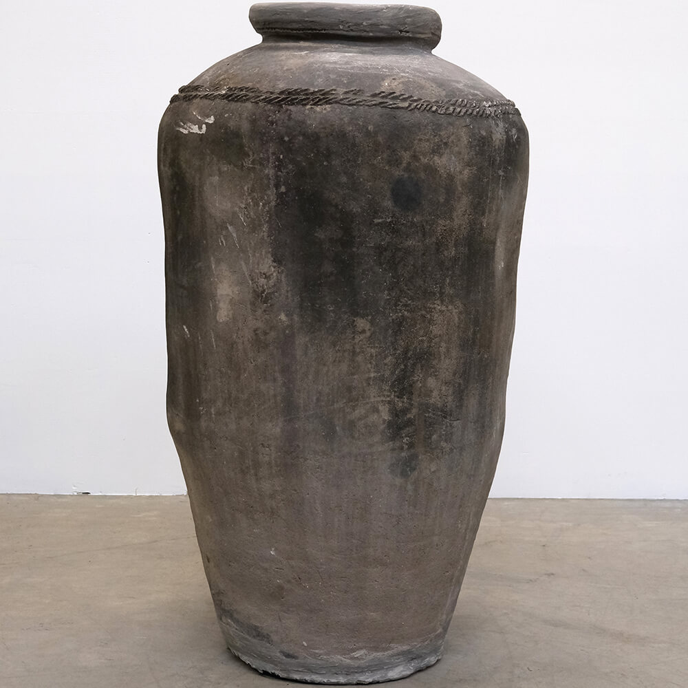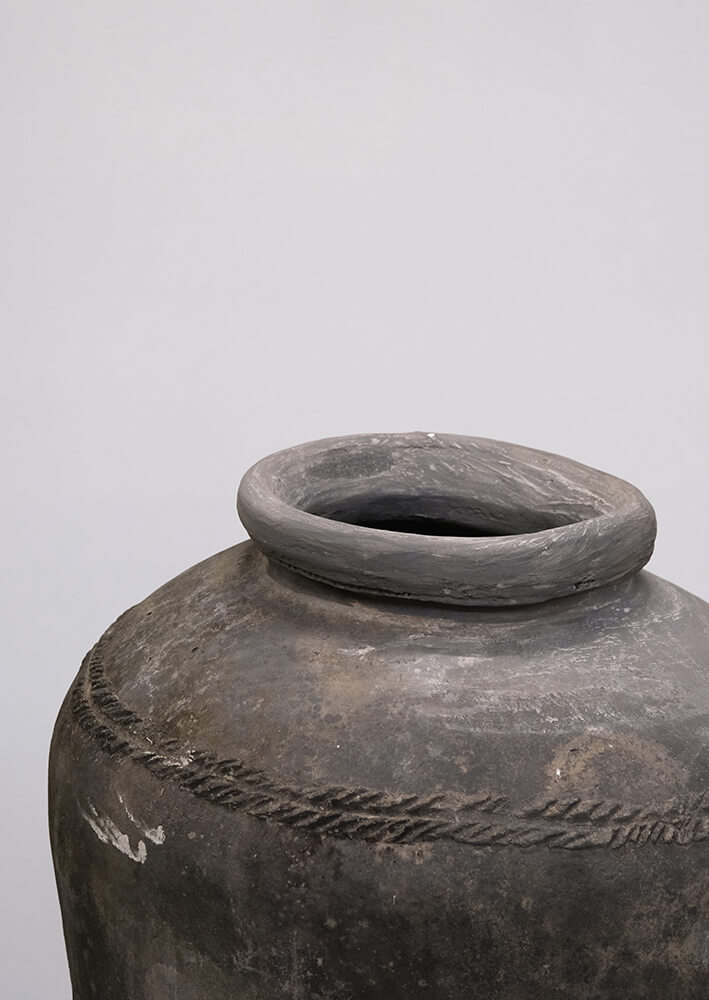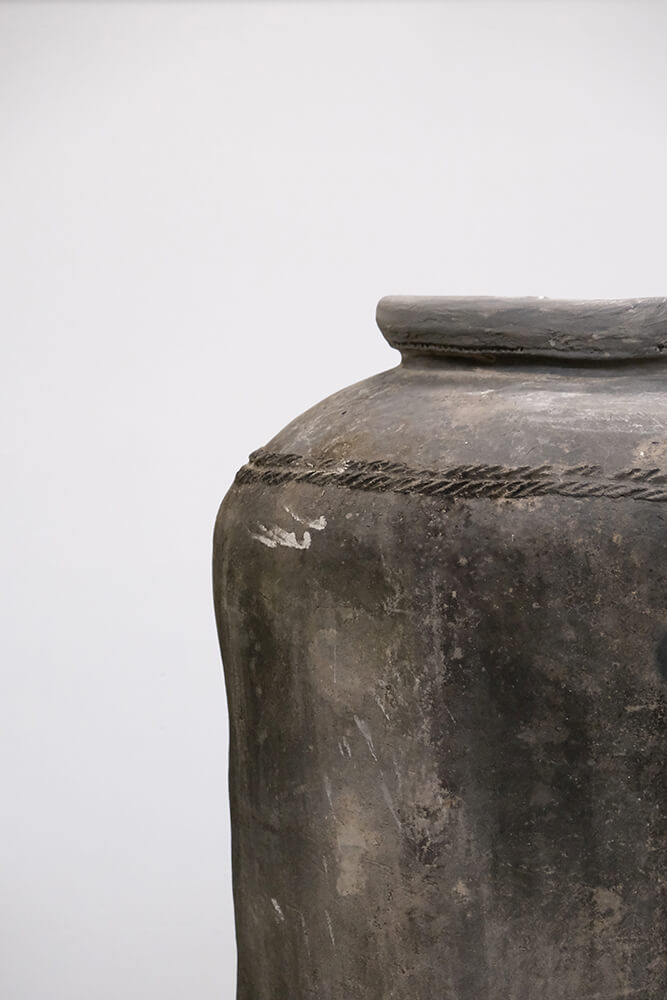 This pot makes an impression, not just in size, but in presence. It is an old, handmade pot with a calm, heavy shape and a surface that has been allowed to age at its own pace. The dusty dark grey tones are broken by light and small traces that only appear when something has stood out in the world long enough. It is not polished, and it is not meant to be. Whether you place a few large branches in it or leave it empty, it draws attention without making noise. Please note: The pot is not waterproof.
