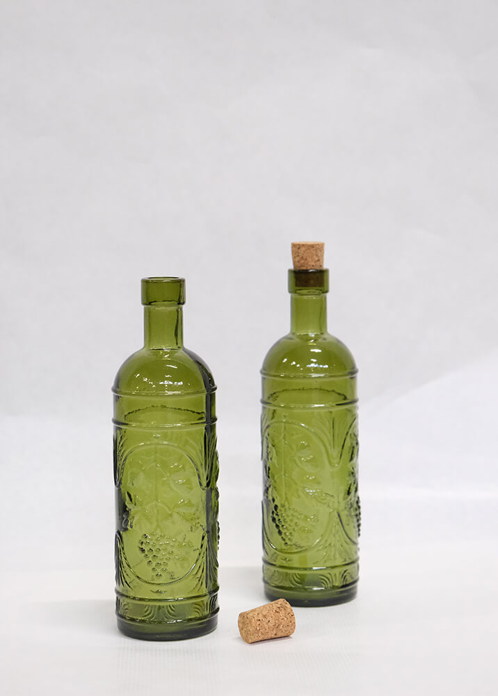 A bottle that radiates charm and vintage vibes. This round glass bottle is made from 100% recycled glass and decorated with a beautiful embossed pattern, giving it a unique expression. The classic cork stopper complements the look, making the bottle both decorative and practical. With a capacity of 500 ml, it can be used for everything from wine and oil to juice or water. You can also use it creatively as a vase for a few simple flowers or as a candleholder with an LED candle or a taper candle. Just remember to blow out the candle before it reaches the edge of the glass. Whether placed on the dining table, in the kitchen, or on a shelf, this bottle is a little piece of everyday magic that adds a personal touch to your interior.