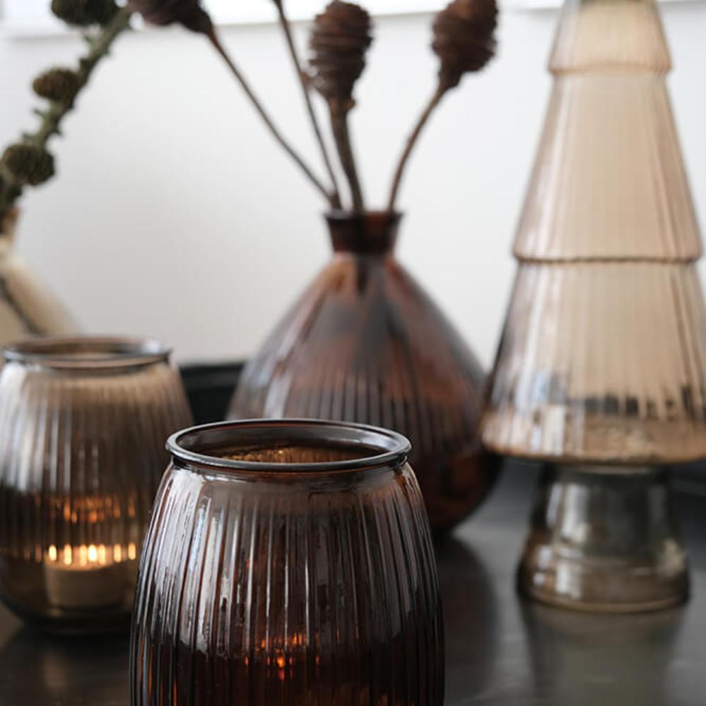 With its deep brown colour and soft shape, this Aniston vase in recycled glass adds a warm contrast to both light and dark surroundings. The ribbed surface comes alive when touched by light, and if you don't have flowers at hand, it works just as well as a tealight holder. Pair it with the Keaton vase and the matching Christmas tree for a cohesive look full of warmth and character.