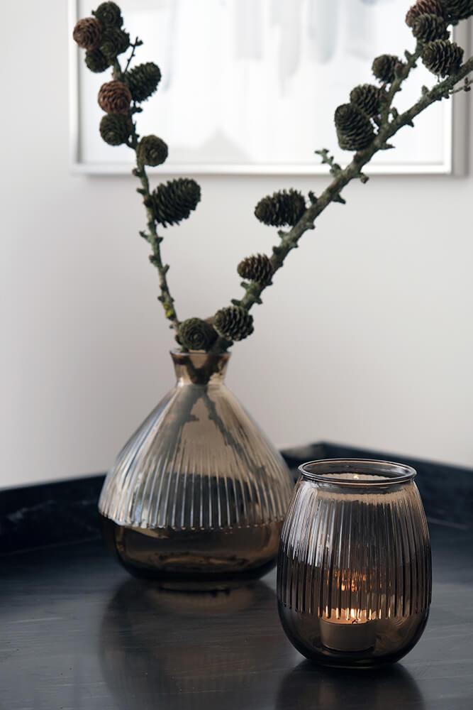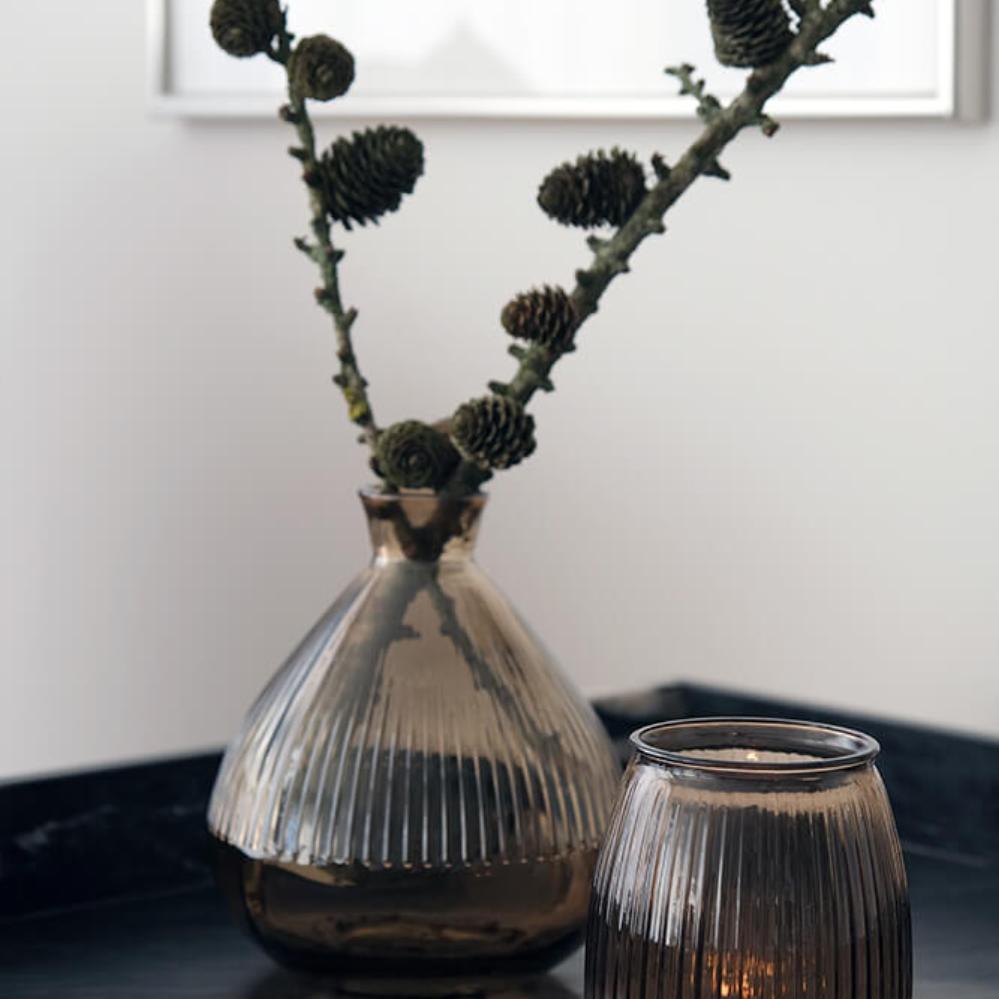 A small vase with great versatility. This Aniston vase in mocha-coloured recycled glass has a soft brown tone and a ribbed surface that adds depth and character. Use it for a small bouquet, a single branch or a tealight candle. Its shape and size pair perfectly with the Keaton vase and the matching glass Christmas tree, and the colour blends beautifully with natural hues and muted decorations.