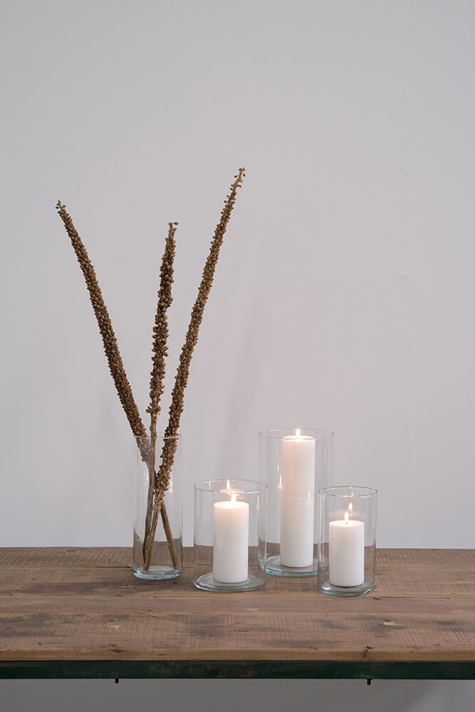 This cylinder glass vase is a must-have for anyone who loves simple and well-thought-out interior design. The transparent glass creates an elegant and airy expression, making the vase suitable for use all year round and in any room. Use it for floral arrangements, green plants, or natural branches, or create a cozy light installation by placing a pillar candle in the center and decorating with seasonal elements around the candle. It can also be used as an insert in a clay pot that is not waterproof. The vase is made of thick, clear glass, making it easy to style for any occasion. Its clean cylindrical shape helps create a calm and harmonious look, which is why it’s also popular for advent candles, wedding decorations, table settings, and window displays. Available in several sizes, allowing you to mix and match to create depth and variation. A vase that suits every style, and one that quickly becomes a favorite in any interior.
