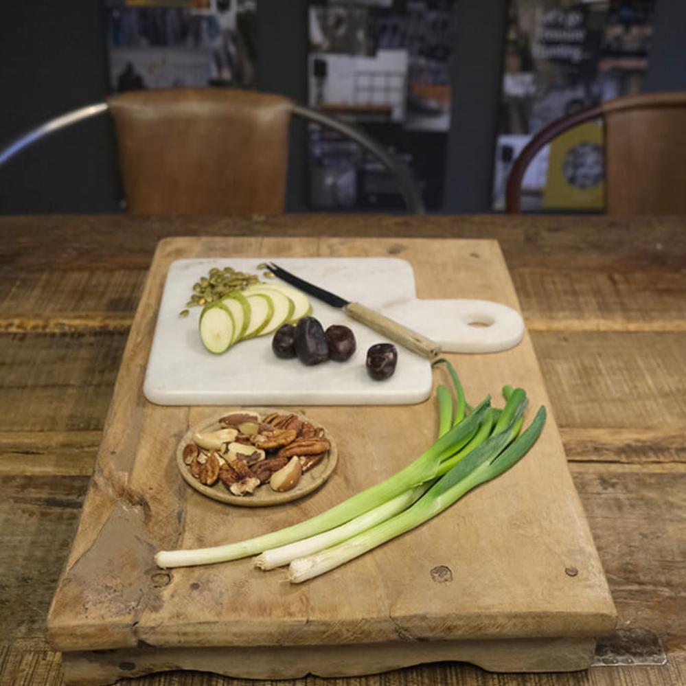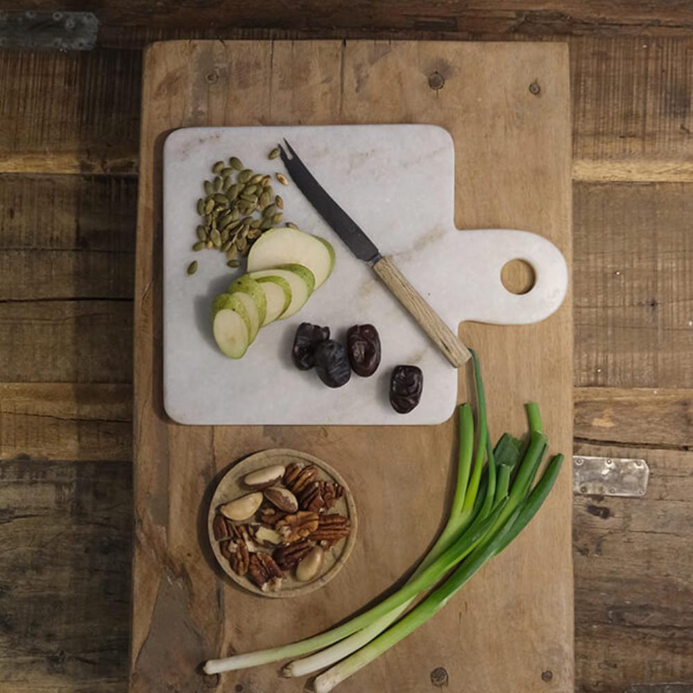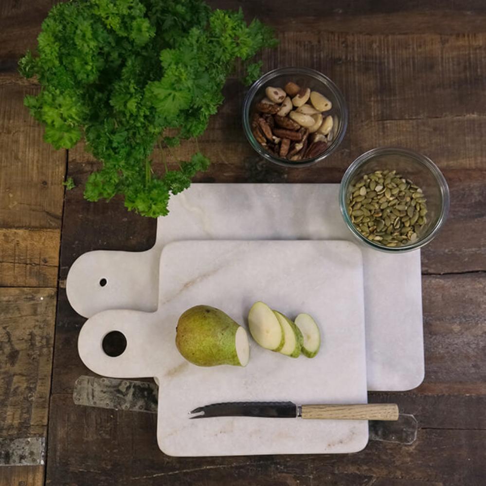 You can use both sides of a marble chopping board for chopping or serving e.g. cheese and tapas. The light marble chopping board is decorative in itself, and will look great in your kitchen as a board to display your oils, salt and herbs on. When it comes to hygiene, marble is the ideal material for chopping boards or serving dishes, as it is not porous and so doesn’t absorb liquids. To clean the marble chopping board, simply use water and soap. Dishwasher not recommended.