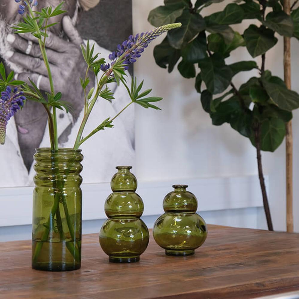 The Berry vase in olive green recycled glass has an organic shape with grooves at the top. The colour evokes the calm of nature while the gently wavy surface adds a natural lightness to the design. By using recycled glass in the production, there’s no need for new raw materials. This means less waste and a second life for old resources – making the vase more than just a decoration. It carries both history and edge. Place it on a bright windowsill where sunlight can dance through the olive green glass. It’s also beautiful with tall reeds or dried flowers and fits perfectly in everything from rustic restaurants to homes that appreciate authenticity.