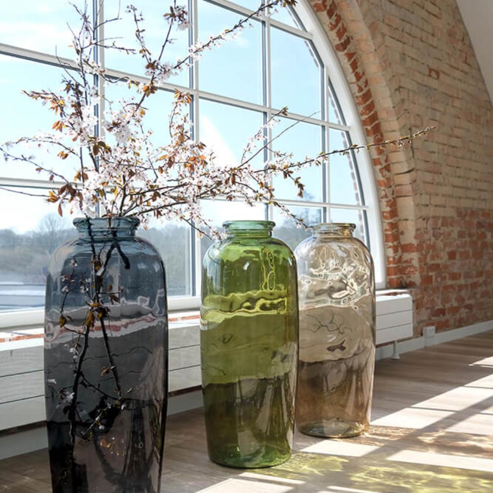 Large decorative vase in a beautiful smokey color. With this large glass vase made of recycled glass, you can add a nice eye-catcher to your decor. Decorate the vase with everything beautiful from nature - large branches or flowers. The vase is also a beautiful sculpture as it is. You can both use the vase in the decor of your home, but it is also great to use in your business. Put one or more together in the foyer of a theater, hotel or cinema. It will be a great first encounter when people enter your universe. If you decorate with the branches of the season, it will also be beautiful to decorate the branches with the holiday decorations of Christmas and Easter. These are just a few suggestions for the many options available with such a large, beautiful vase in recycled glass.