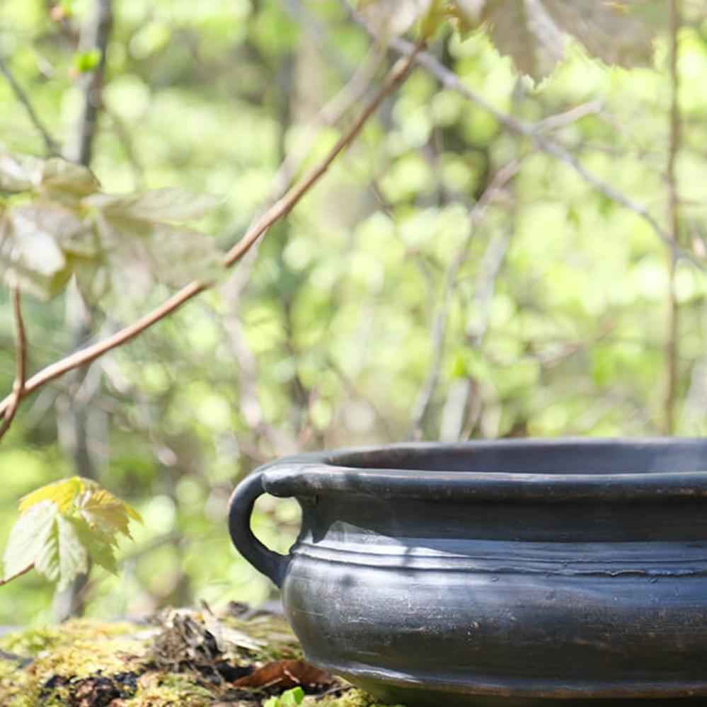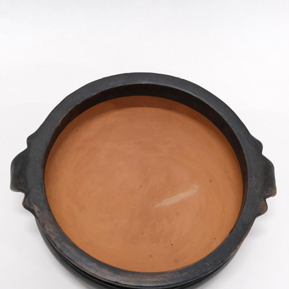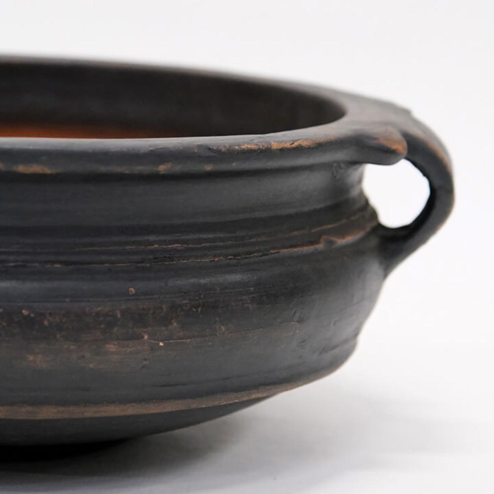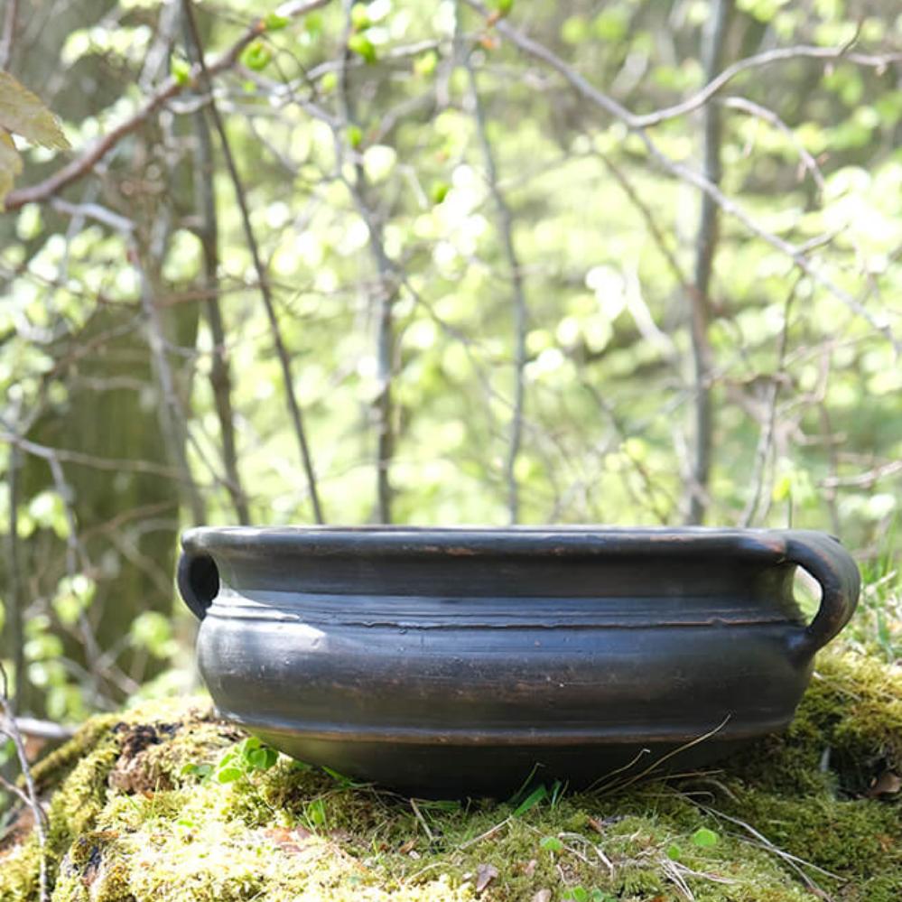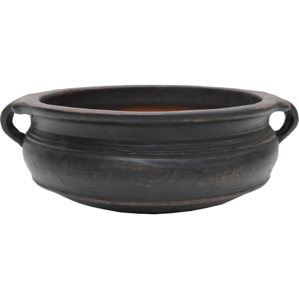 Beautiful, handmade clay pot with handle. The pot is dark and has a nice patina, which in places lets the red-brown color of the clay come into view. It is not waterproof, but use a plastic or glass insert at the bottom of the pot.