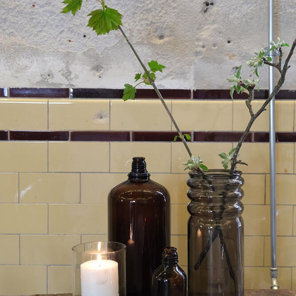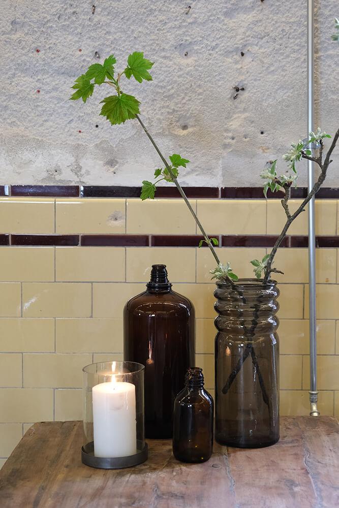 Very small, eye-catching, original industrial glass bottle in strong brown glass. Add an extra little touch to the decor with these small, industrial glass bottles. The Cemmi bottles have previously been used for storing various chemicals, but we prefer a single stem or branch. The Cemmi bottles are available in several different sizes which can be combined for a more personal look.