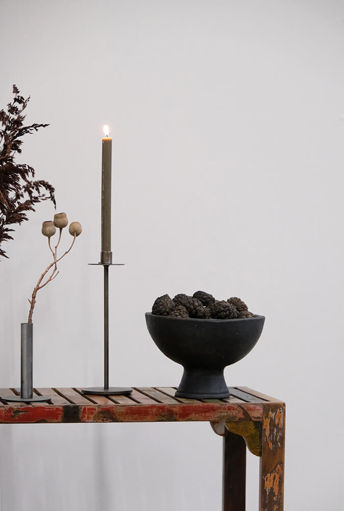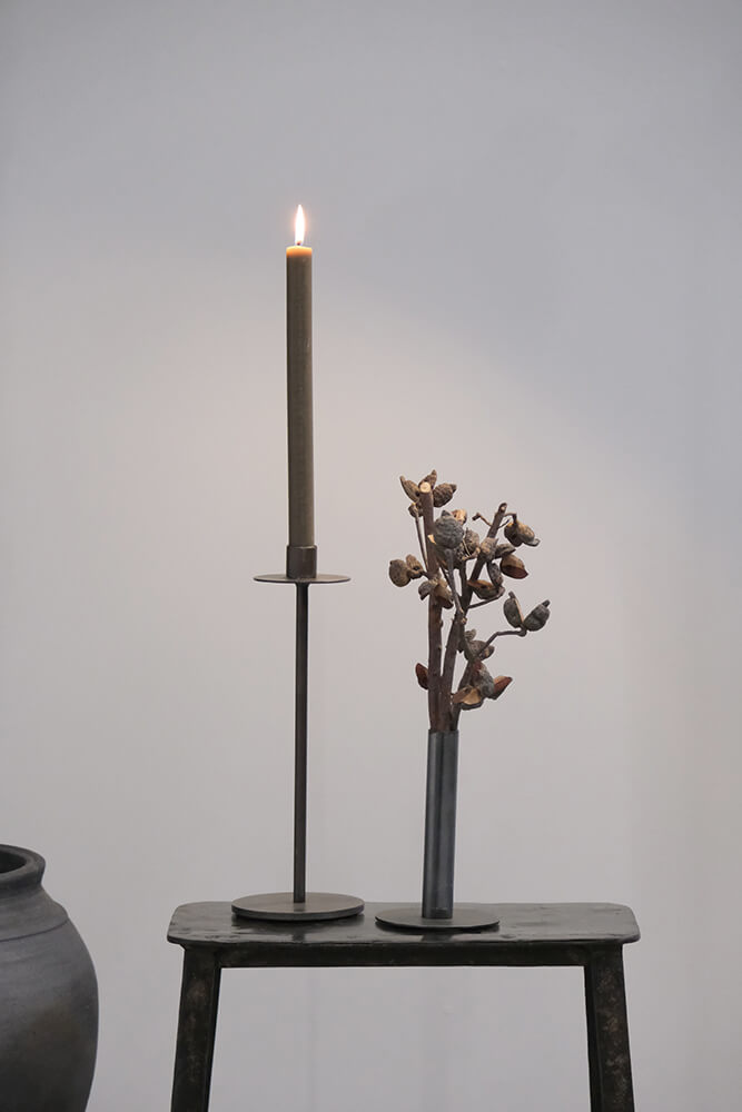 This iron candle holder is simple and timeless in its design. It has a slim shape and stands on a round base, providing stability. At the top, there is a discreet holder for a candle, ensuring it stands securely and burns without dripping. The minimalist look and raw, industrial style make this candle holder an ideal choice for those who want to add a touch of masculine edge to their decor. Perfect for creating warmth and atmosphere in both modern and rustic spaces. Place it on the floor alongside the three other matching sizes in the Dean series or use it alone in your table setting or as part of a still life display.
