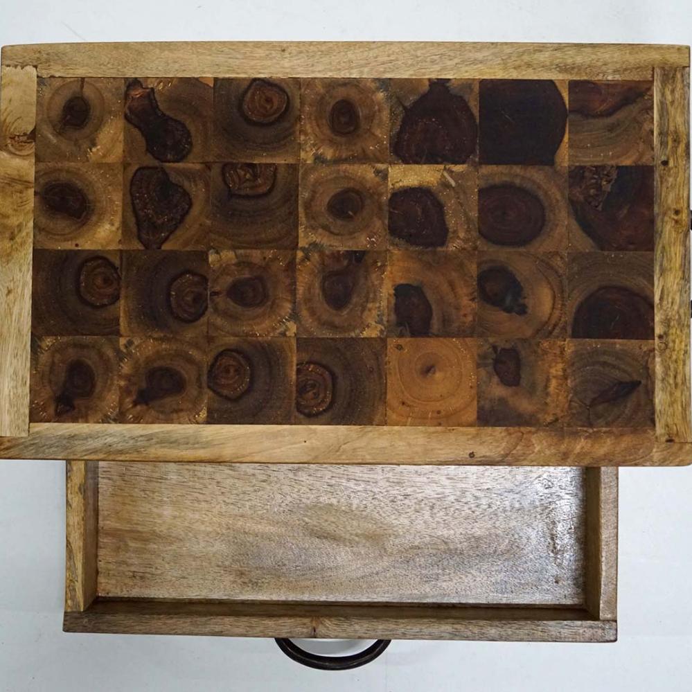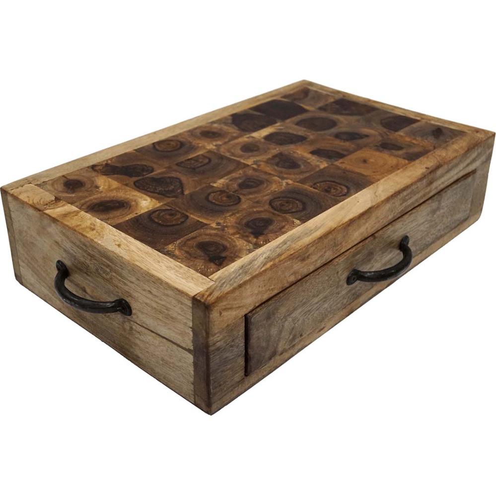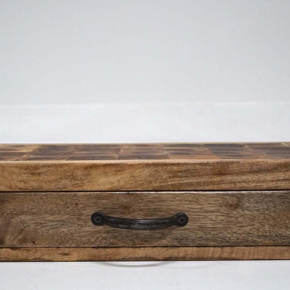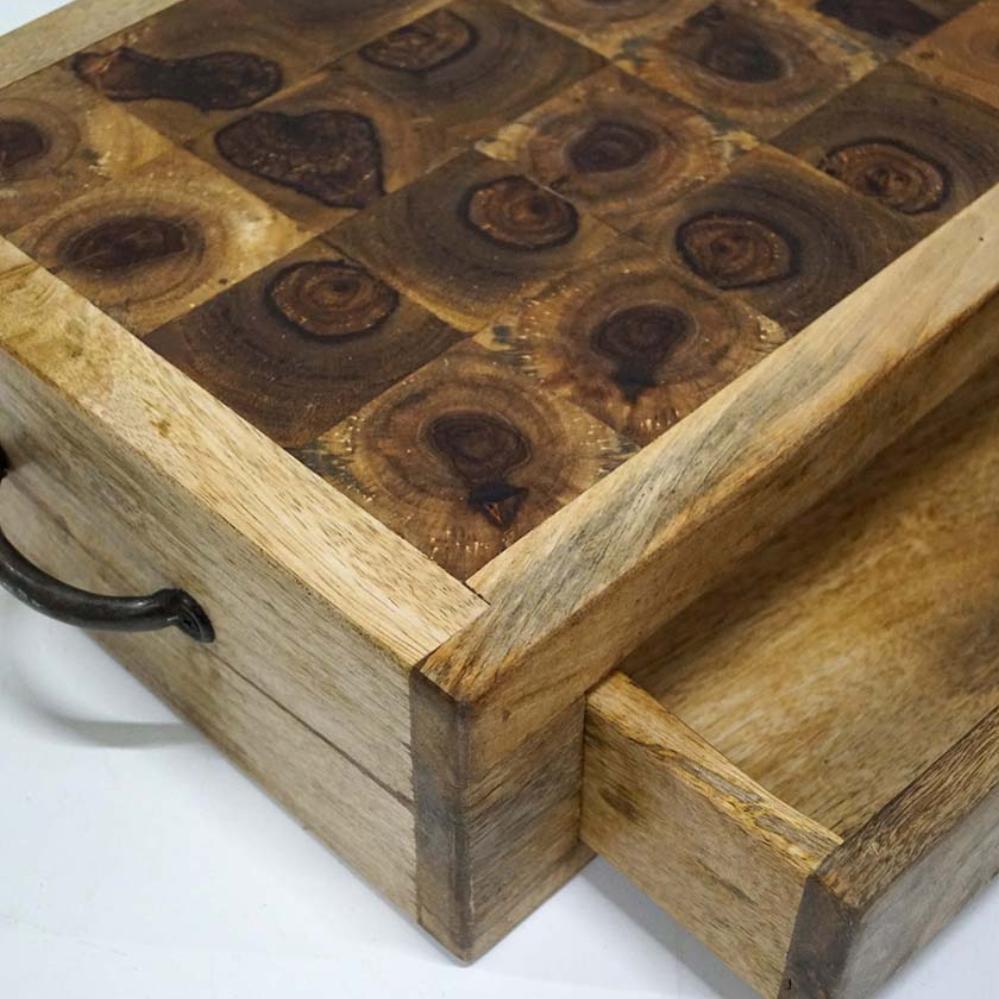 Rustic wooden cutting board with removable and functional drawer, where the chopped items easily can be stored and moved to a large pot. Clean it with soap and water. You will extend the duarability by using vegetable oil on the board. Not suitable for dishwashers.