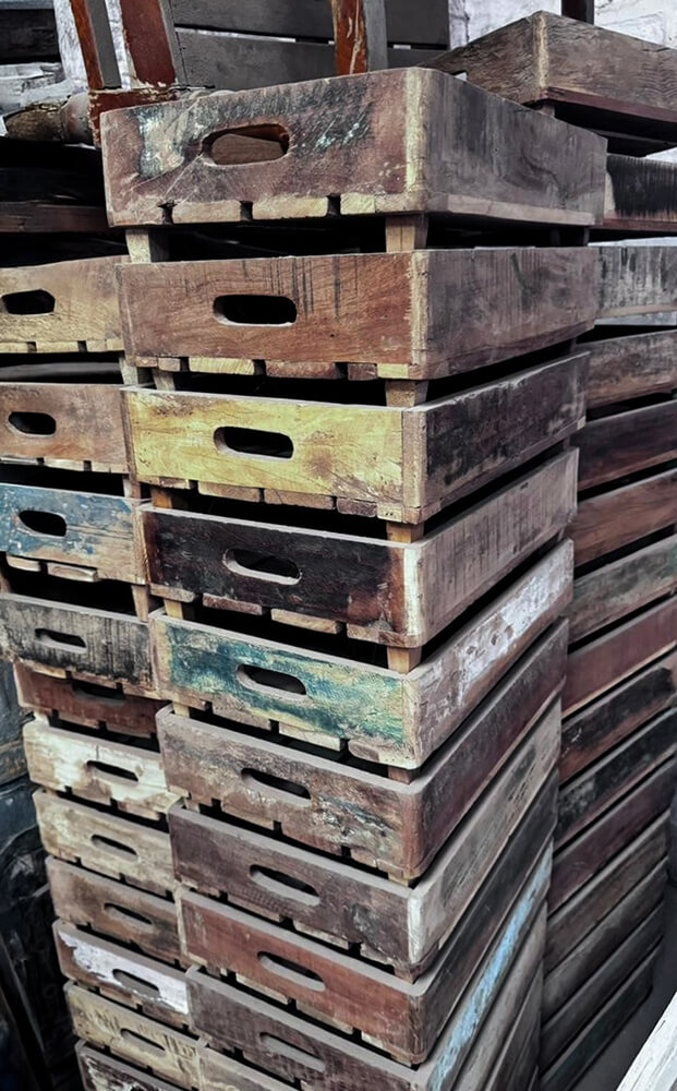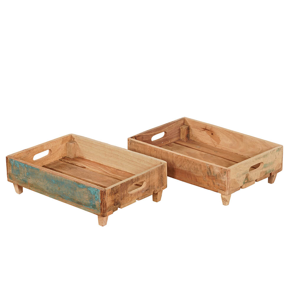 This wooden tray with legs has a raw and authentic expression, where the reclaimed wood clearly shows signs of previous use. The wood features beautiful wear marks, traces of colour, and natural variations that give the tray plenty of character and a unique look. The carved handles on the sides make it easy to move around, while the small legs lift the tray slightly from the surface and create a lighter, more decorative appearance. The trays can be stacked, making them both practical and flexible in use. They are perfect for storage, for displaying products in a shop, as a fruit tray in the kitchen, or for decoration with plants, candles, and other favourites. A decorative and versatile solution full of history.