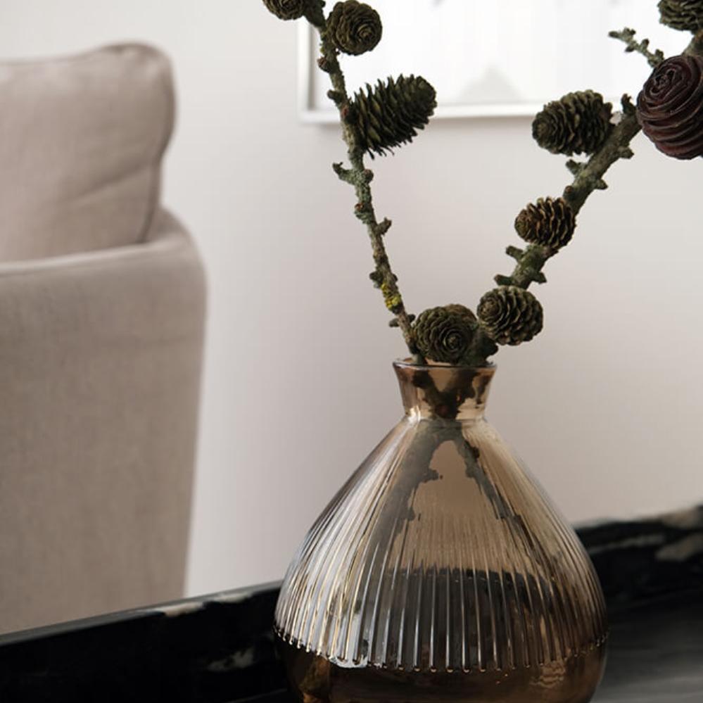 The Keaton vase, in light mocha-coloured recycled glass, features an organic, rounded shape that complements its contents beautifully, whether empty or full. The ribbed glass catches the light, creating a vibrant expression. Its warm tone suits both dried branches and fresh greenery and pairs easily with the Aniston vase and the glass Christmas tree in the same series if you're aiming for a calm and cohesive decoration.