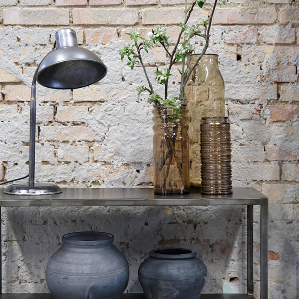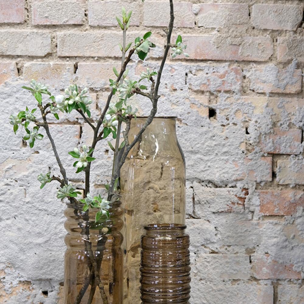The Lawrence vase in smoked recycled glass brings a simple, clean look that fits perfectly in both modern and industrial spaces. The glass may feature small variations and details that make each vase slightly different. The smoked tone is stylish without being too polished, creating a natural contrast to lighter interiors or warm wood types. Place it in the centre of a dining table, in the corner of a showroom, or as a calm base in a window display. The vase looks beautiful both with and without contents and works just as well in a private home as in a raw café or shop setting.