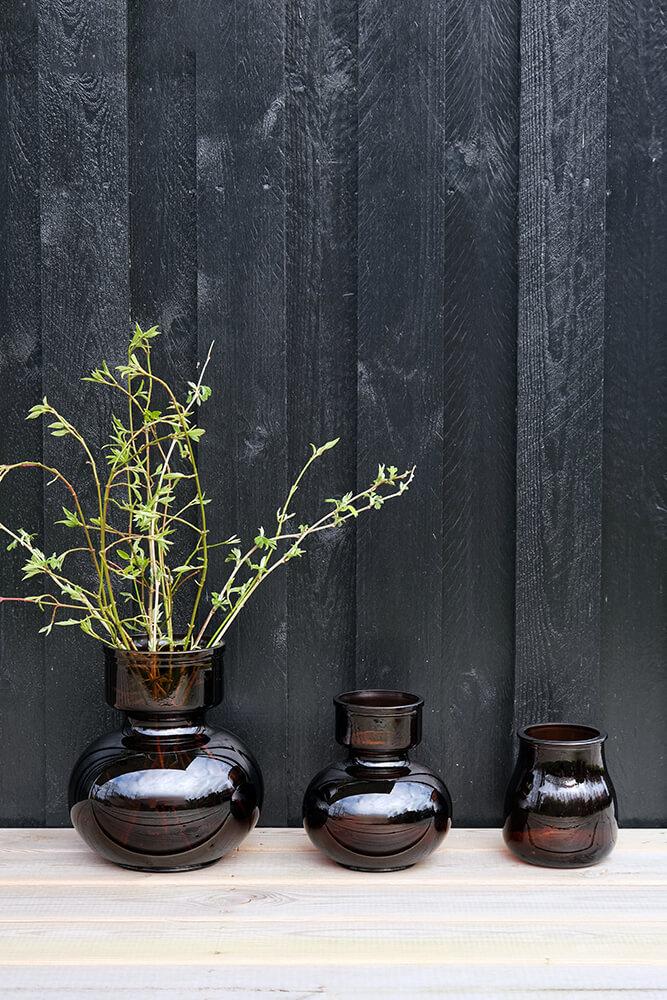 Let the Lawrence vase in recycled glas bring harmony and tranquillity into your home. With its 15 cm in height, it's perfectly placed on a rustic wooden table or on a windowsill where it can catch and reflect the soft light of the day. This chocolate-coloured vase is like a piece of the finest dark chocolate, rich and full of depth. Whether you choose to highlight the vase with fresh flowers, a cosy pillar candle, or leave it standing alone, its rustic charm and simplicity will undoubtedly add a sense of warmth and style to your decor.