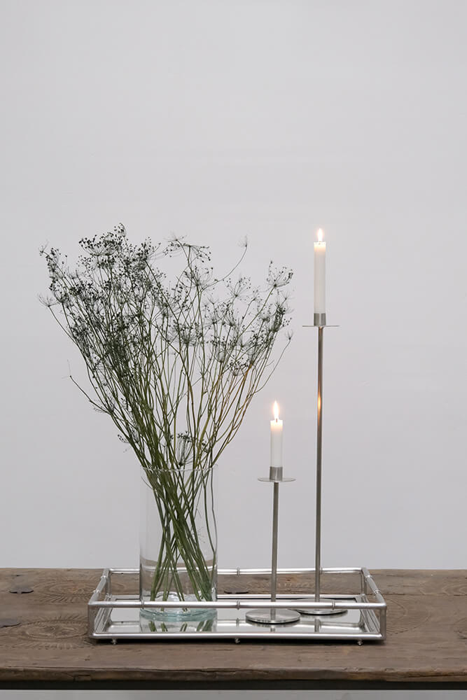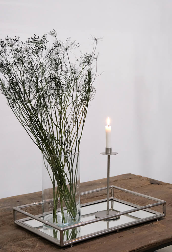 This mirror tray in shiny iron has a clean and raw expression with a cooler, more modern look. The polished iron finish gives the tray a sophisticated feel and works beautifully with the mirrored base, adding both depth and a sense of exclusivity. The combination of metal and mirror creates a striking contrast that catches the light and highlights the items you place on the tray. The mirrored base adds an extra dimension to styling, candles, glassware, perfumes, or small decorative objects gain an almost floating appearance when reflected in the mirror. The tray is both practical and decorative and can be used in a bar setting, at home, or in a shop. A versatile mirror tray that fits perfectly into modern, industrial, or minimalist interiors.