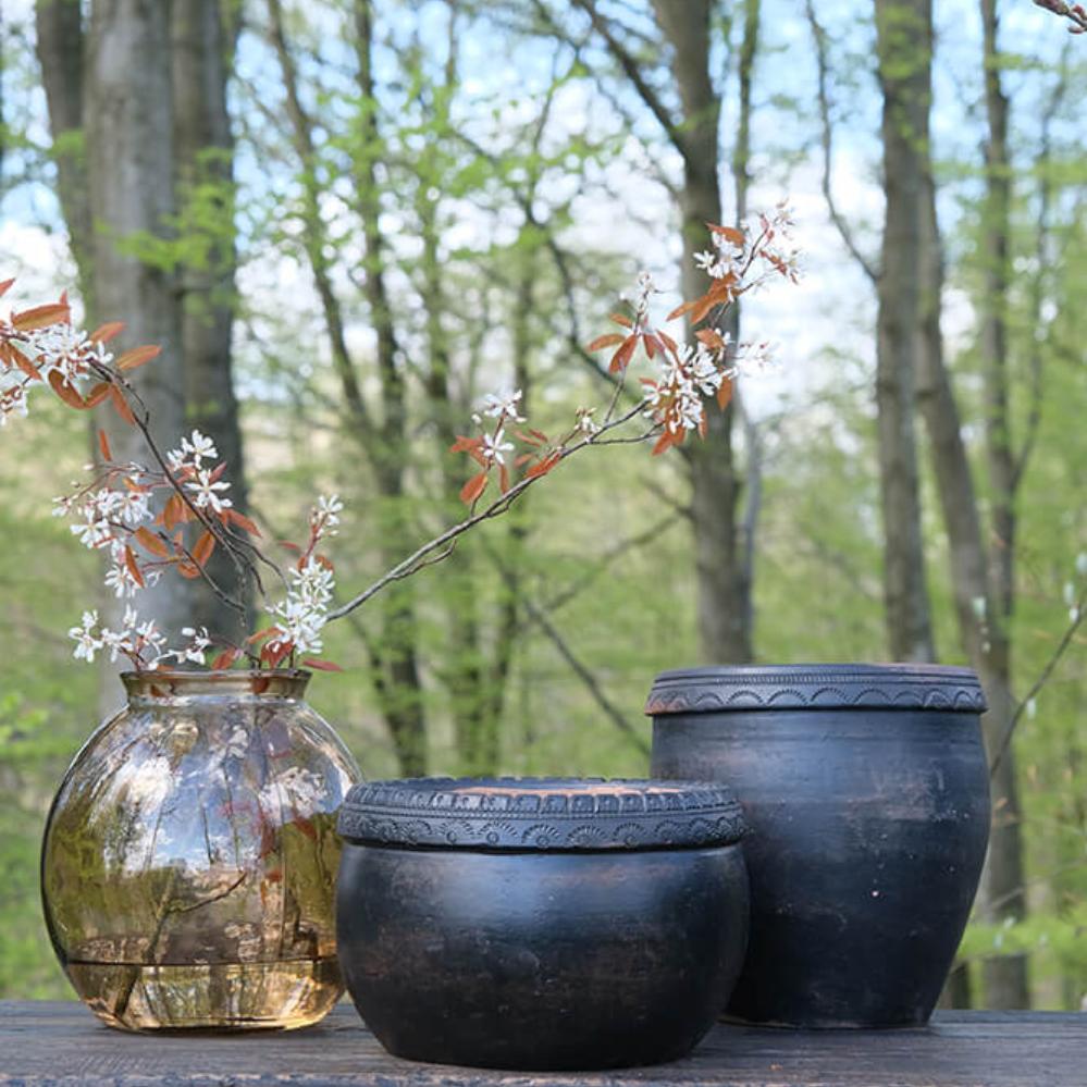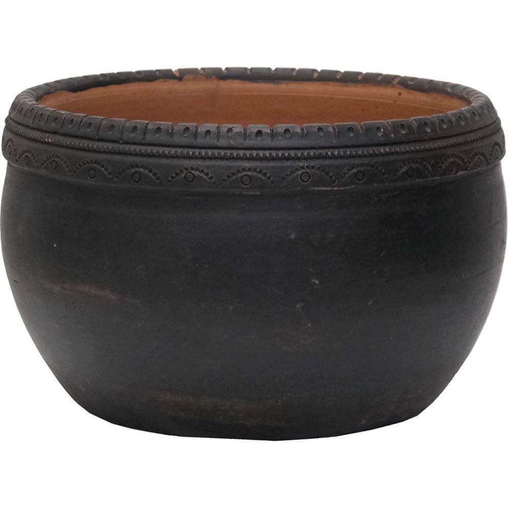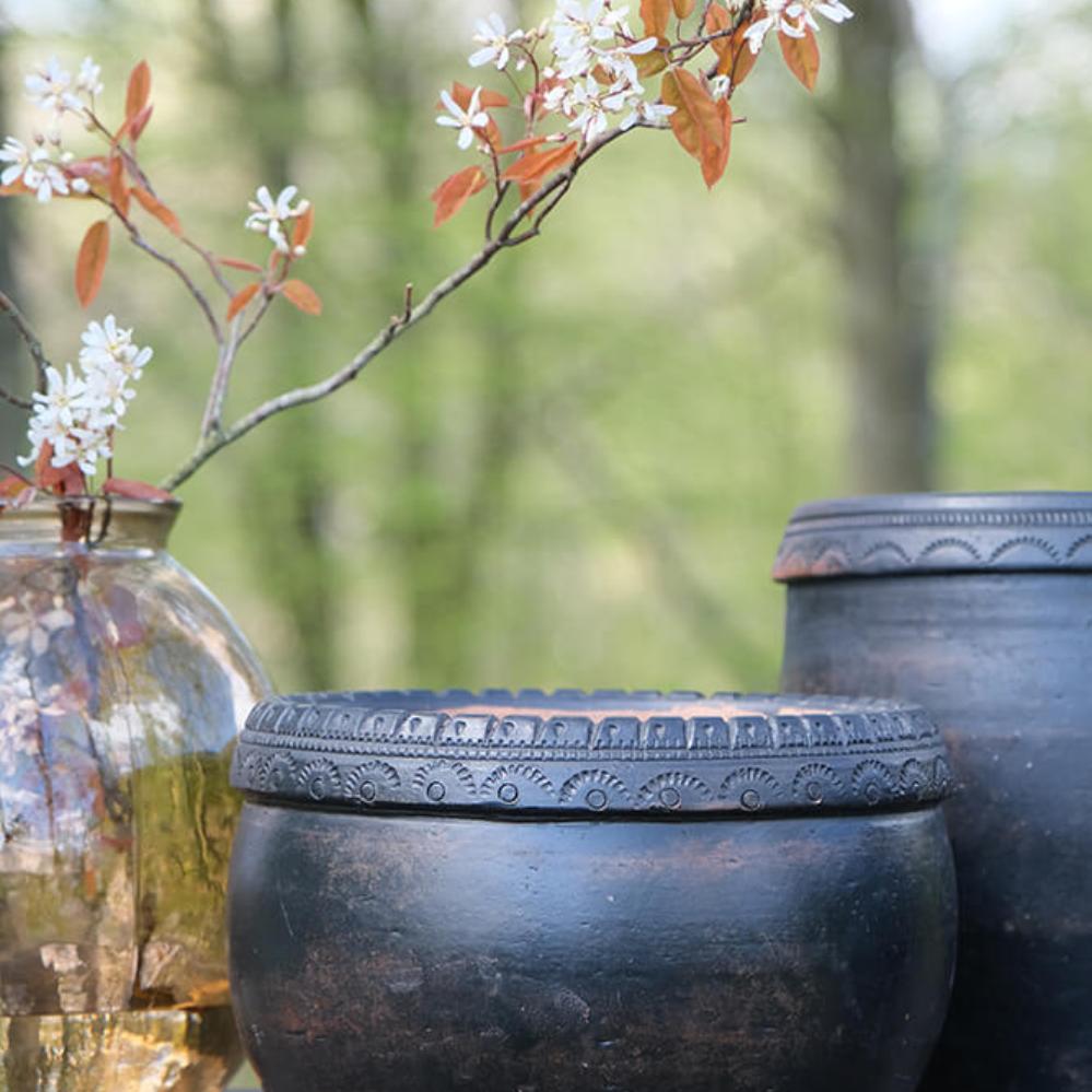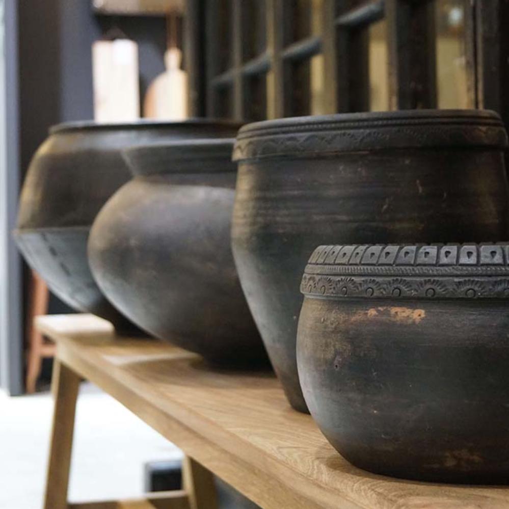Clay pot with beautiful details and a really nice rustic patina. This clay pot with beautiful details on top has a great patina. With or without plants it will create a cozy atmosphere and a remarkable style. The pot is not waterproof, but can be used for plants with a glass / plastic insert.