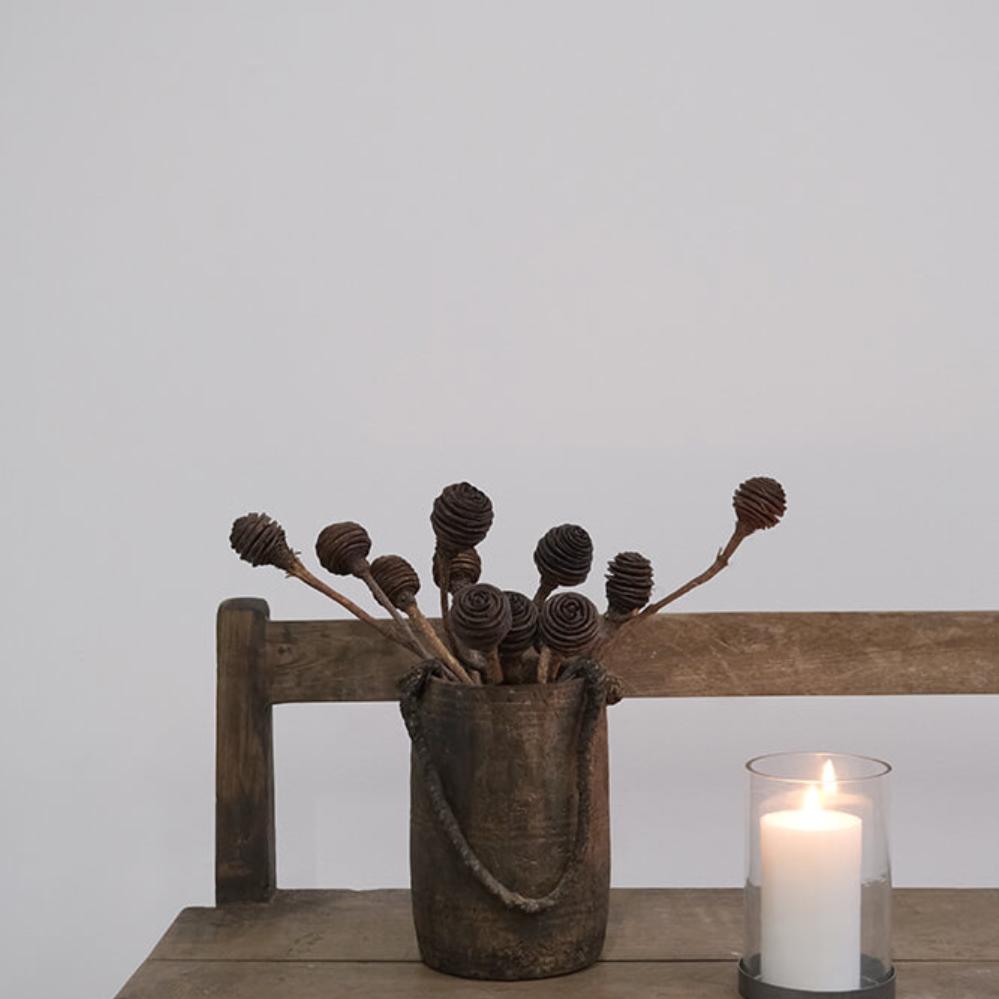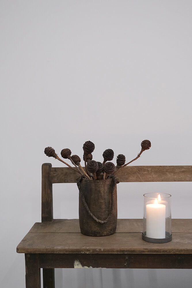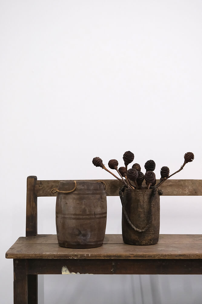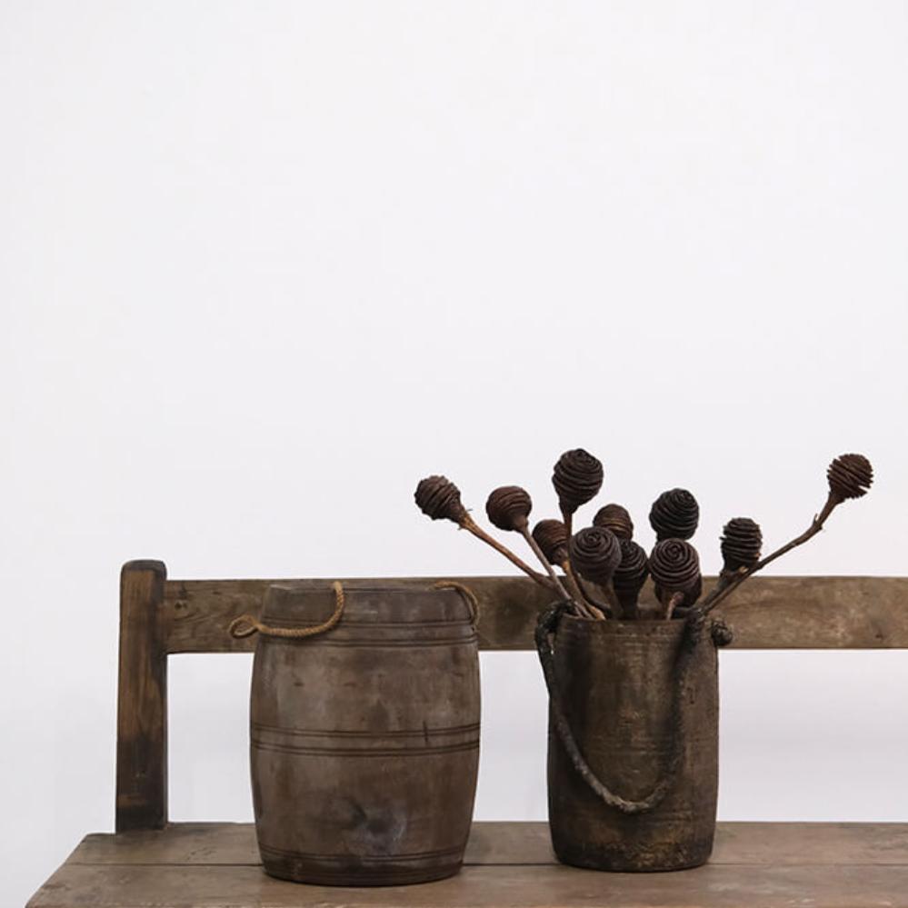 These old water jugs have each lived a life before ending up here with us. Unique in both shape and color, they measure between 20 and 27 cm in height. Once used for scooping water, today they’re perfect as decorative pieces full of authentic patina. The rough surface, hand-forged details, and juterope make each jug a natural eye-catcher in raw and rustic surroundings. Hang one with a plant, use it as a table decoration, or let it sit on a shelf and tell its own story. A small wooden sculpture disguised as functional art. For those who love the quirky, the worn, and the real.