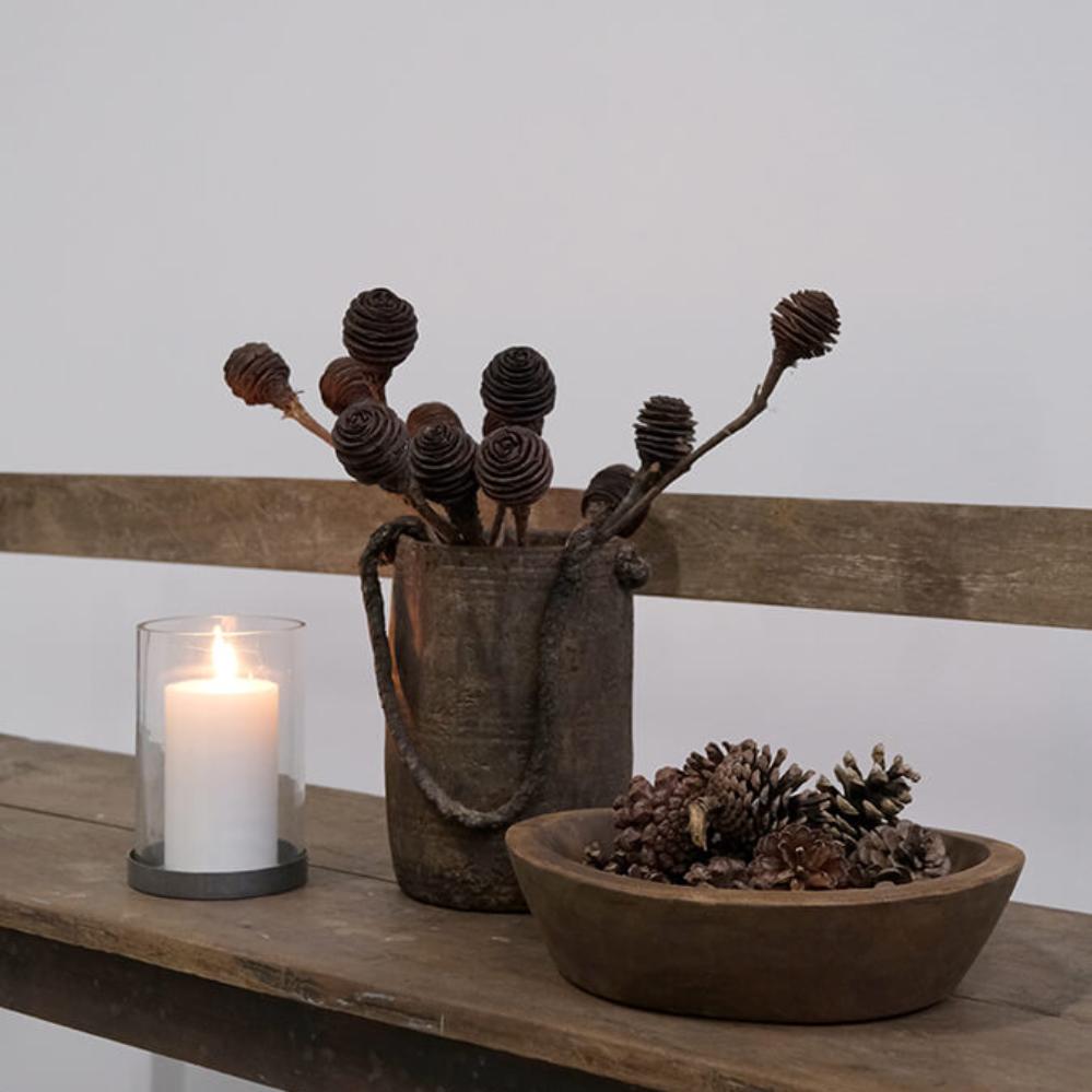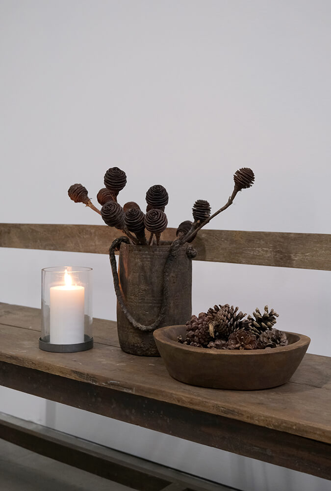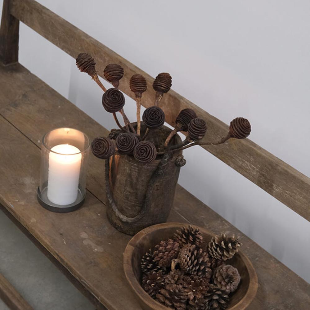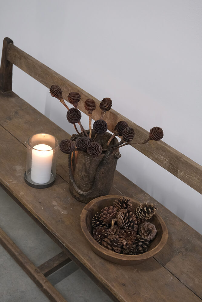 These old water jugs have each lived a life before ending up here with us. Unique in both shape and color, they measure between 20 and 27 cm in height. Once used for scooping water, today they’re perfect as decorative pieces full of authentic patina. The rough surface, hand-forged details, and juterope make each jug a natural eye-catcher in raw and rustic surroundings. Hang one with a plant, use it as a table decoration, or let it sit on a shelf and tell its own story. A small wooden sculpture disguised as functional art. For those who love the quirky, the worn, and the real.