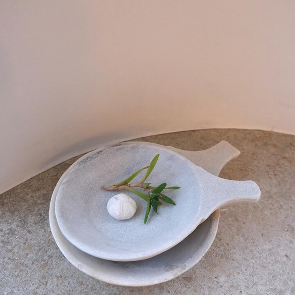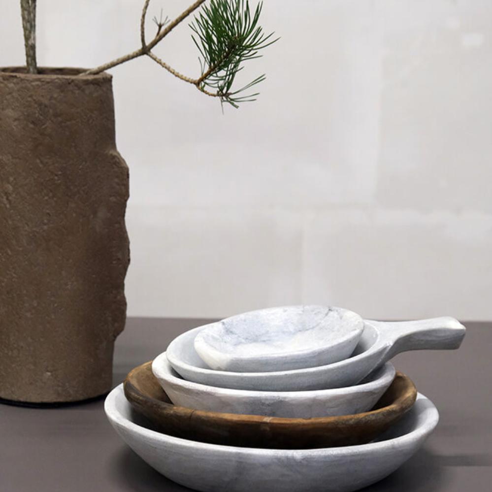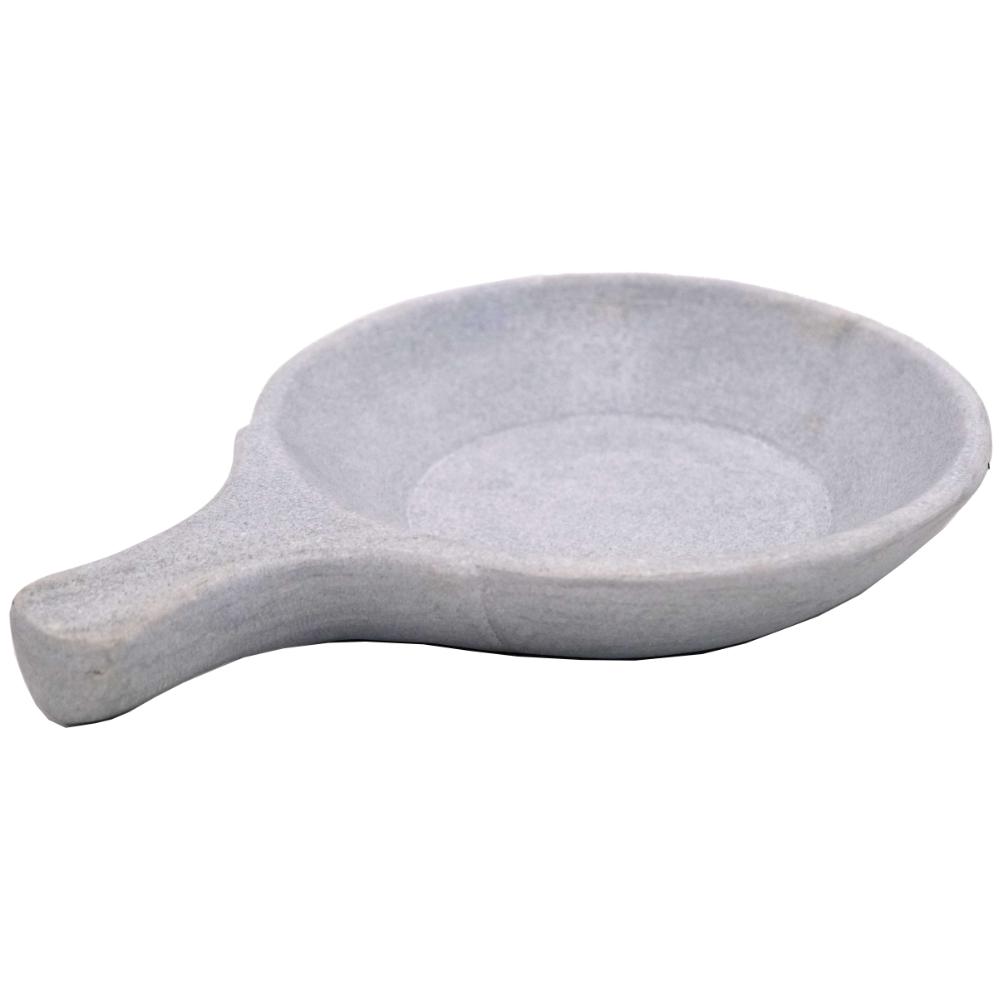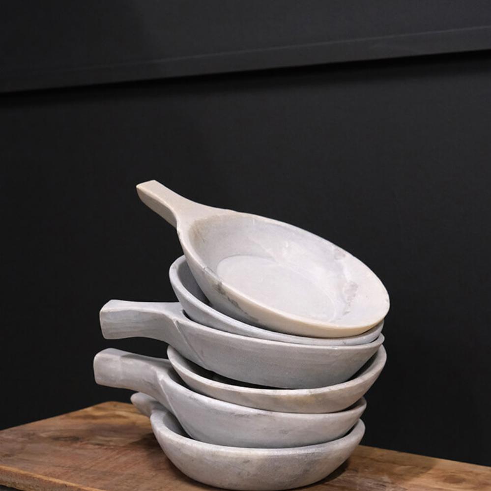 Simple, large marble bowl with a handle made of light marble with marbling pattern. The bowl is both decorative and practical for e.g. storing jewelry, keys and other small items or to present a delicious dish.