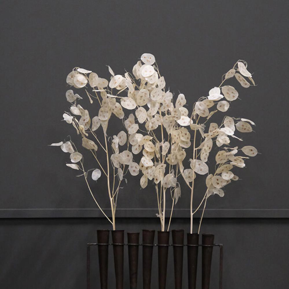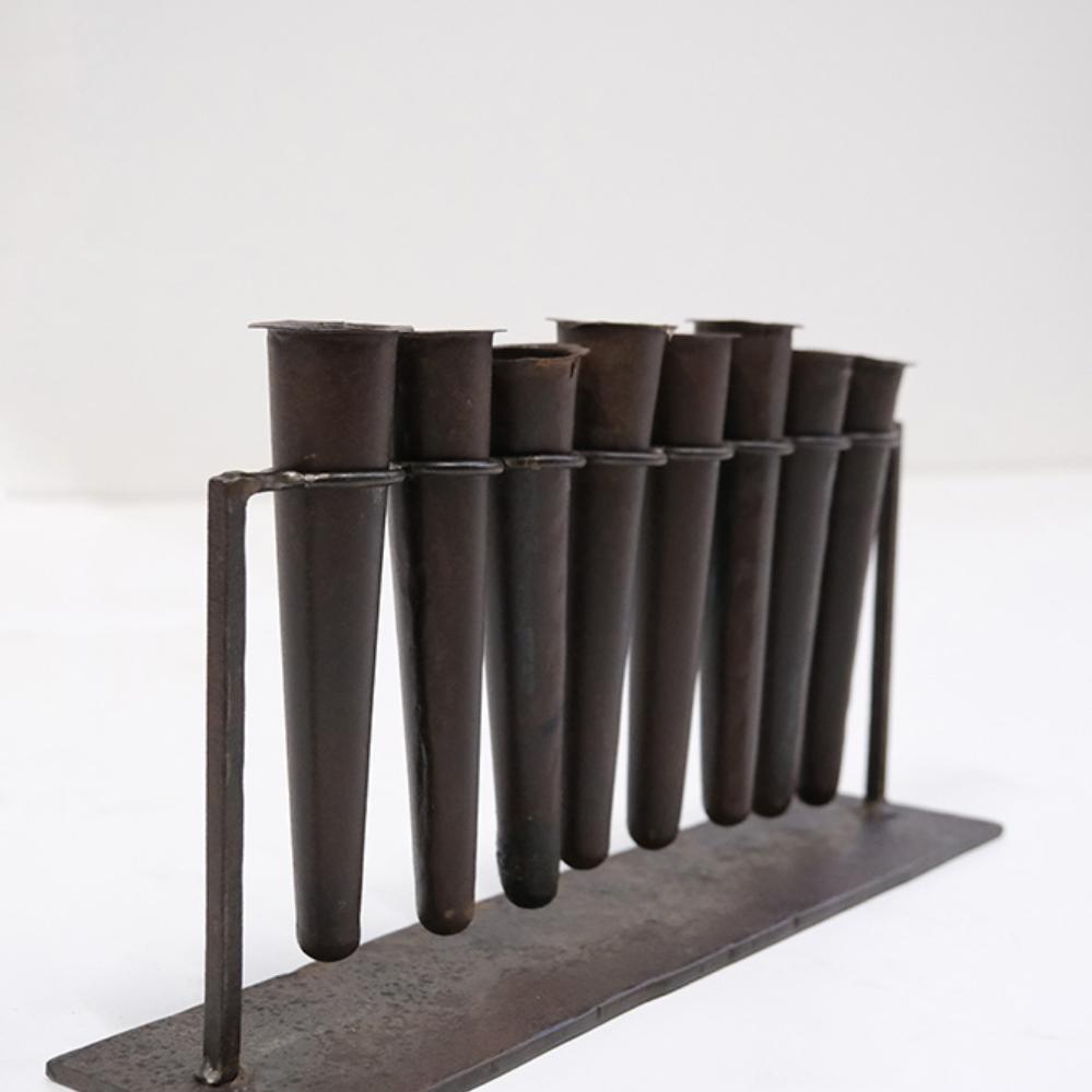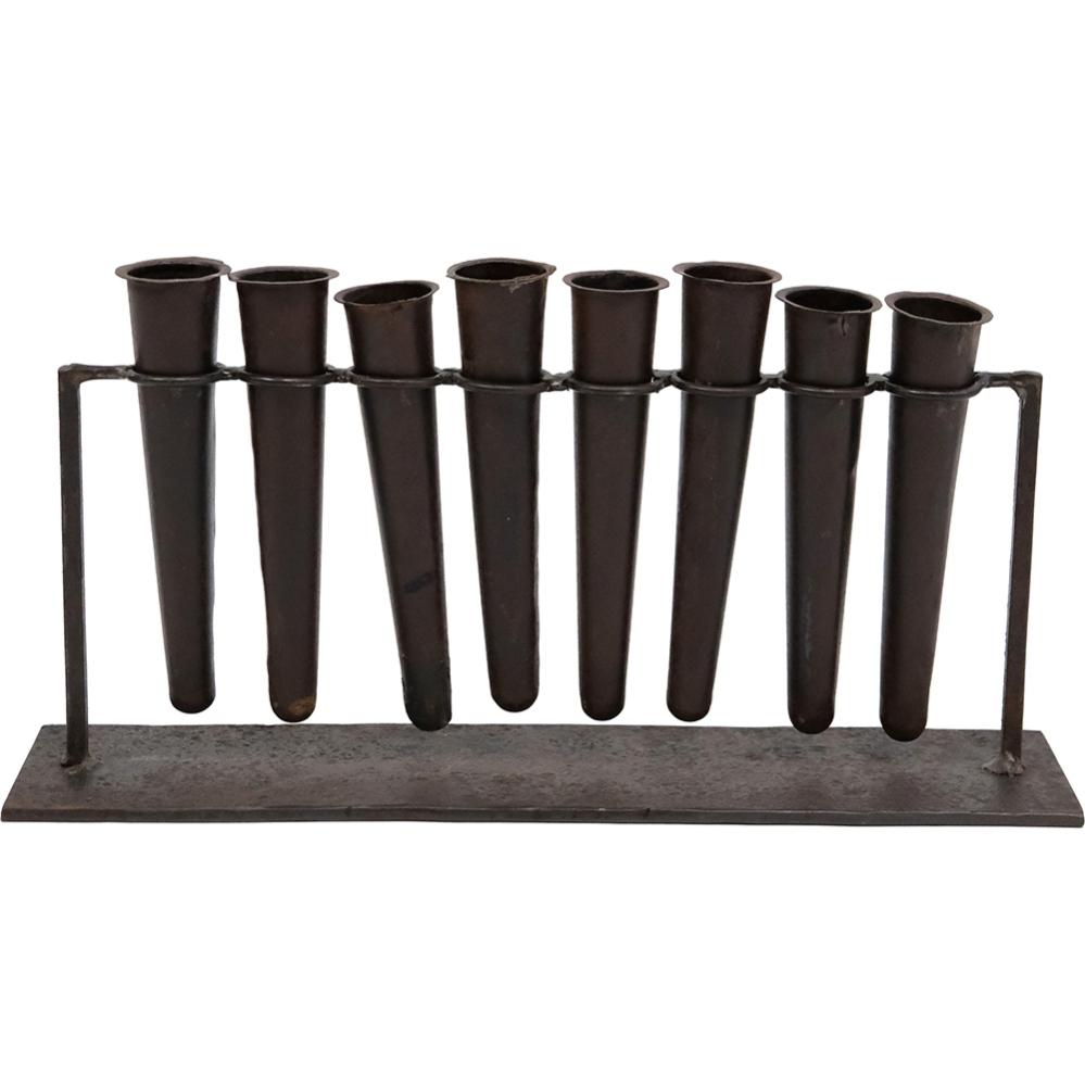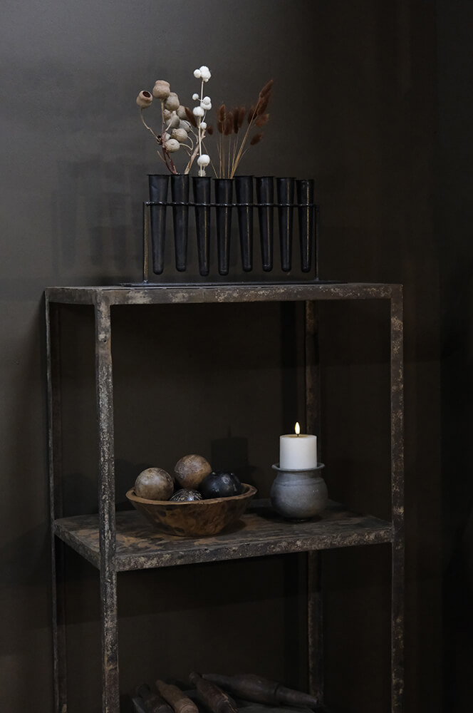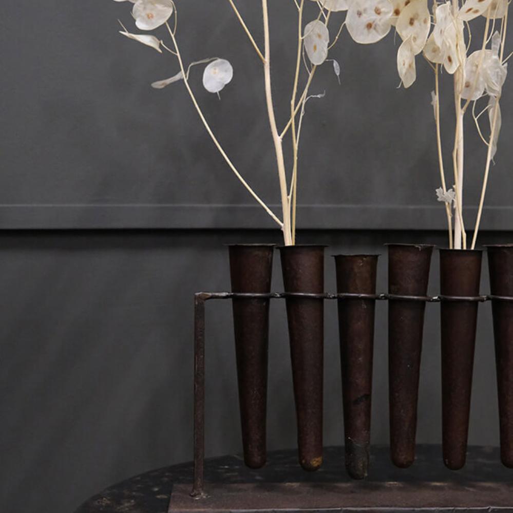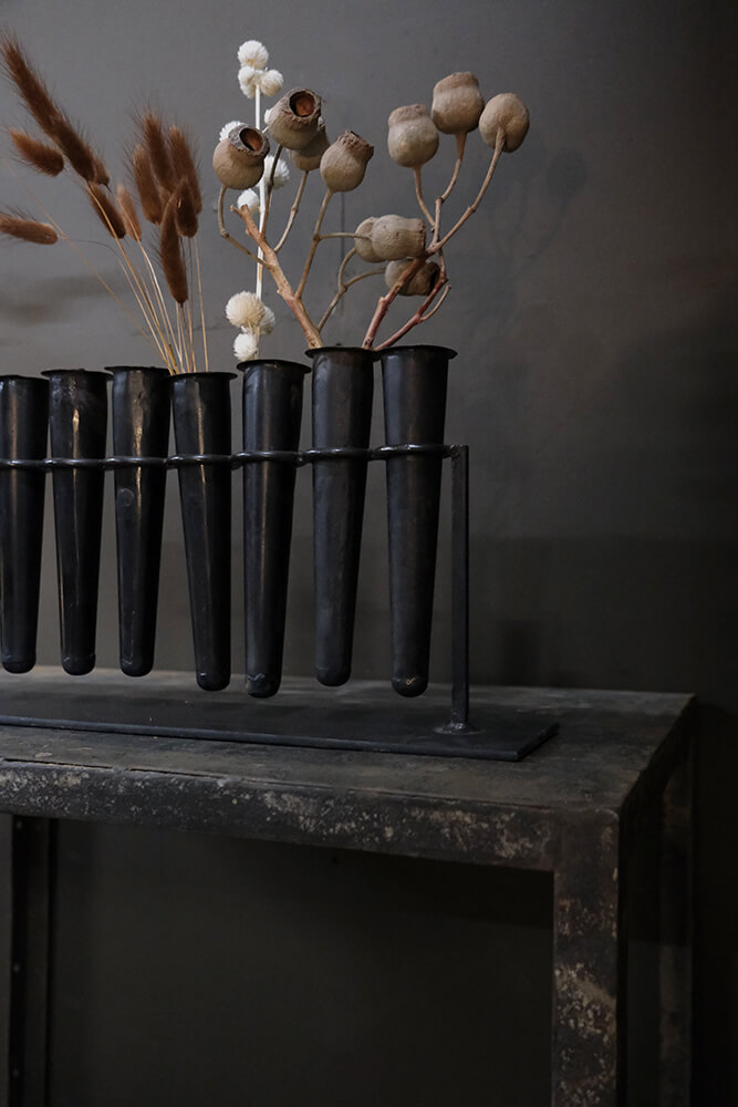 Robbie stand with eight small metal vases - a fun and versatile way to bring the beauty of nature into your home. The 8 small vases were originally used as ice molds but have now been upcycled to hold your beautiful flower creations. The stand is raw and industrial, and the eight small metal vases provide a rustic frame for your favorite flowers or green branches.