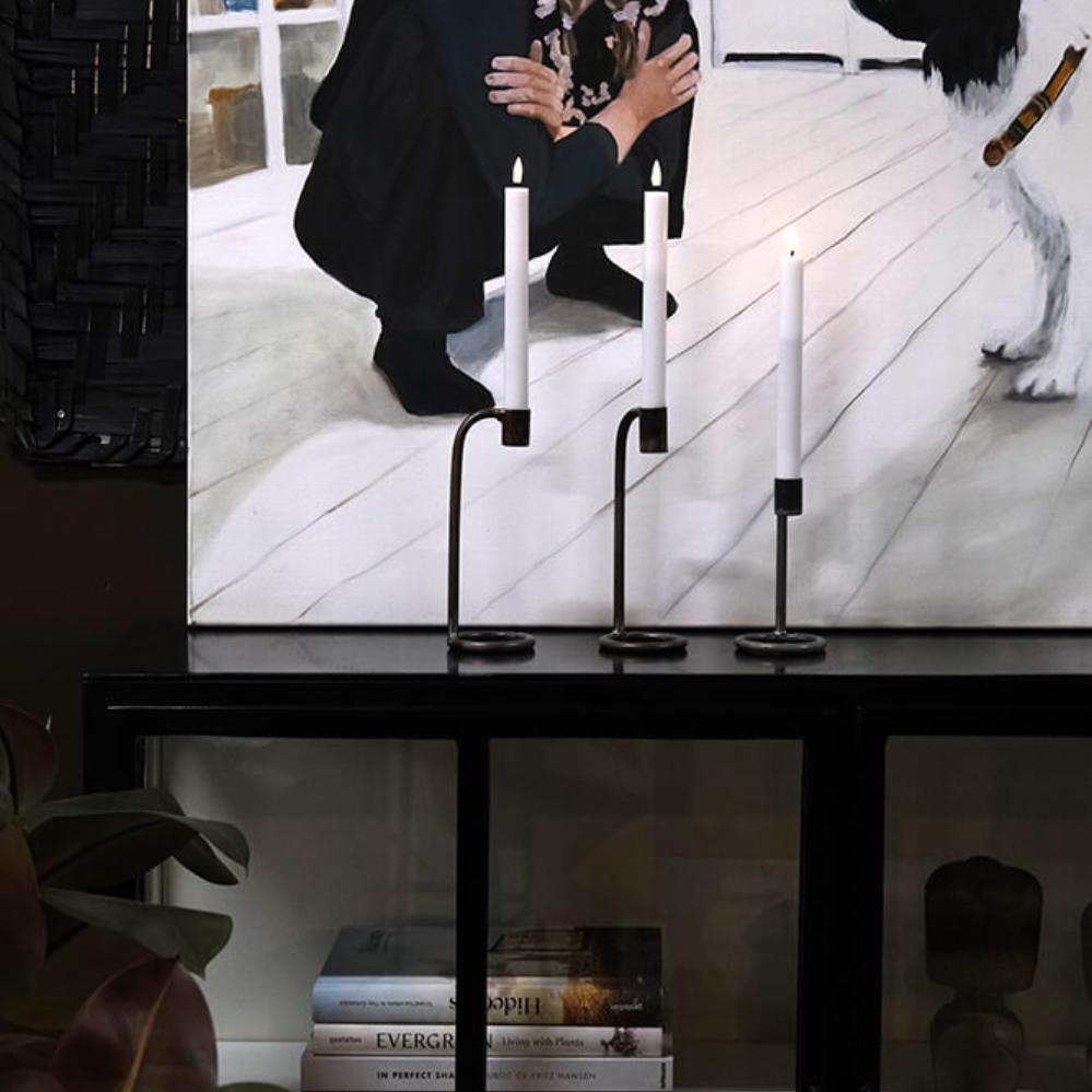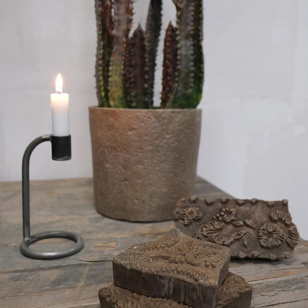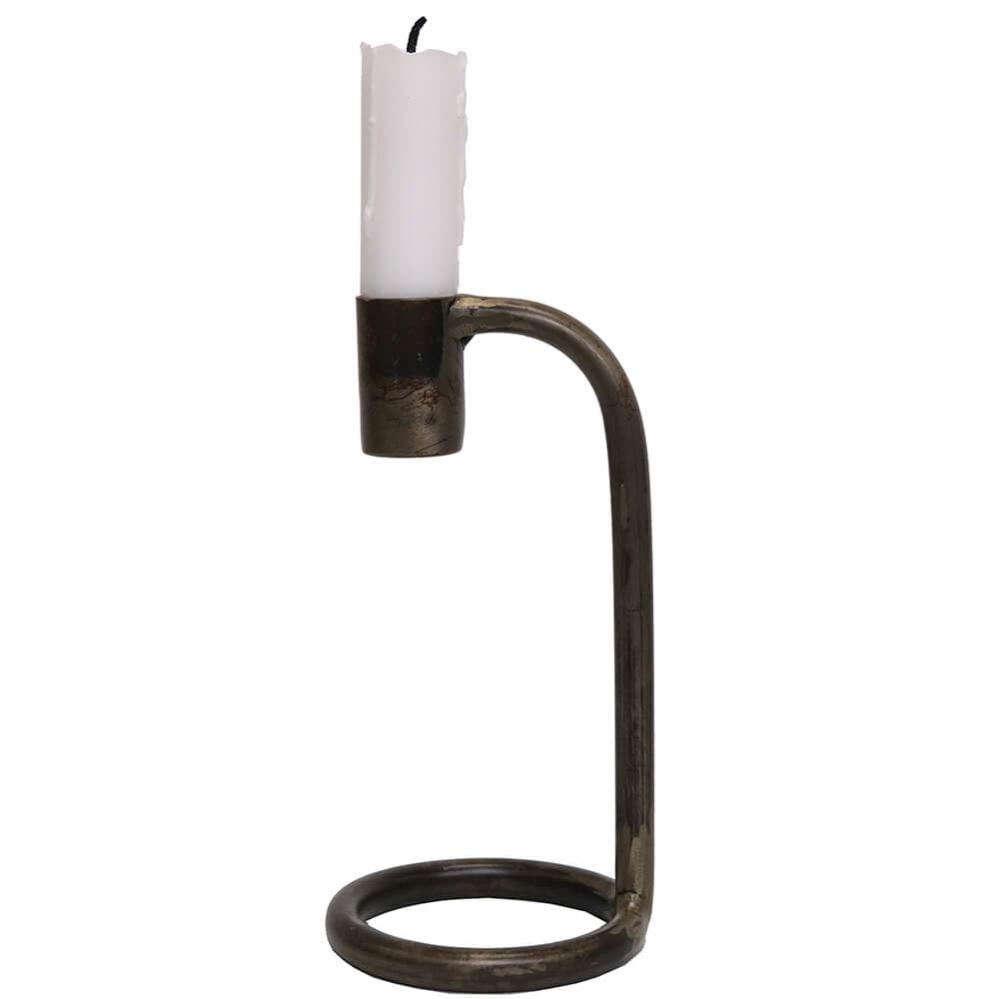 Beautiful and simple candle holder in iron with a height of 16 cm. It features a sleek, industrial design with a round base and curved shape that adds a light and modern touch. The holder fits a taper candle perfectly and can be used on its own as a simple statement piece or combined with other candle holders to create a warm and cozy atmosphere in your interior.