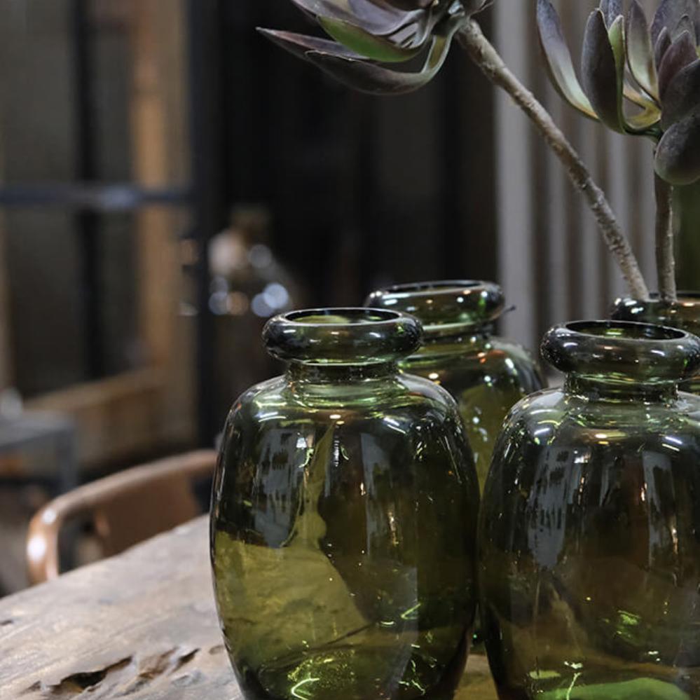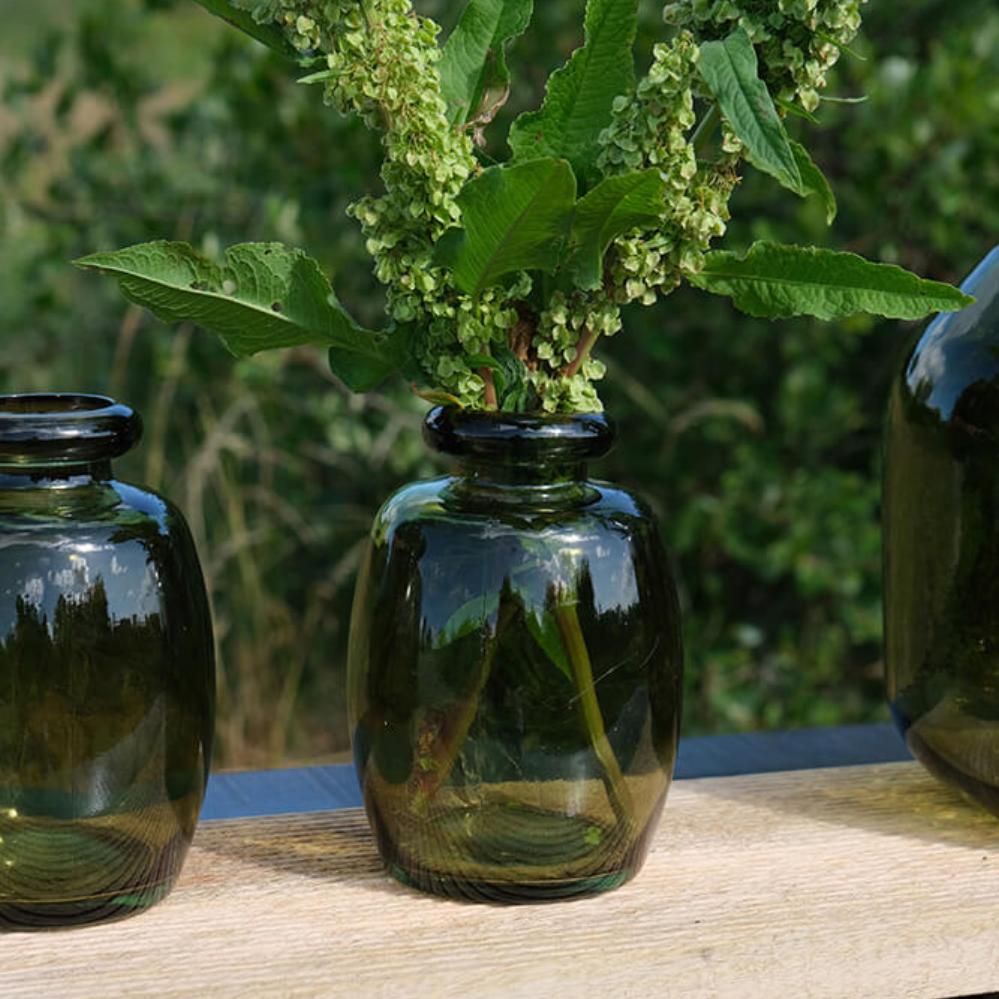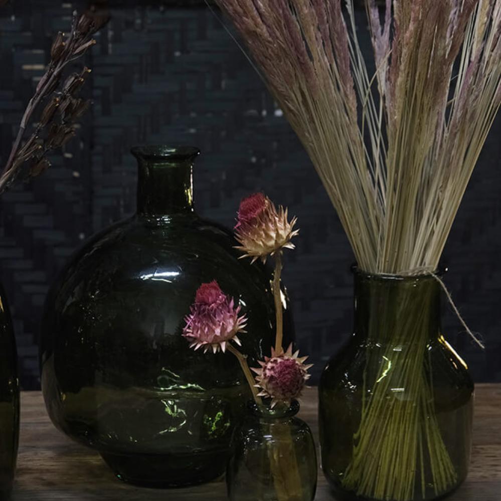 Beautiful olive green glassv ase in recycled glass for everything from fragrant favorite flowers to decorative branches. You can also easily use it simply as a decorative element in your home or with a raw candlestick. Or go all in and match it with several vases in the same shade of color, with dried or real flowers.