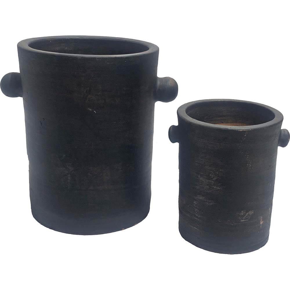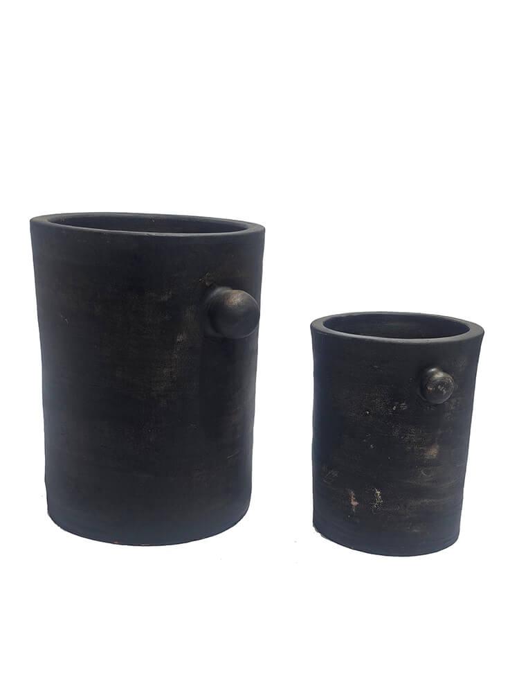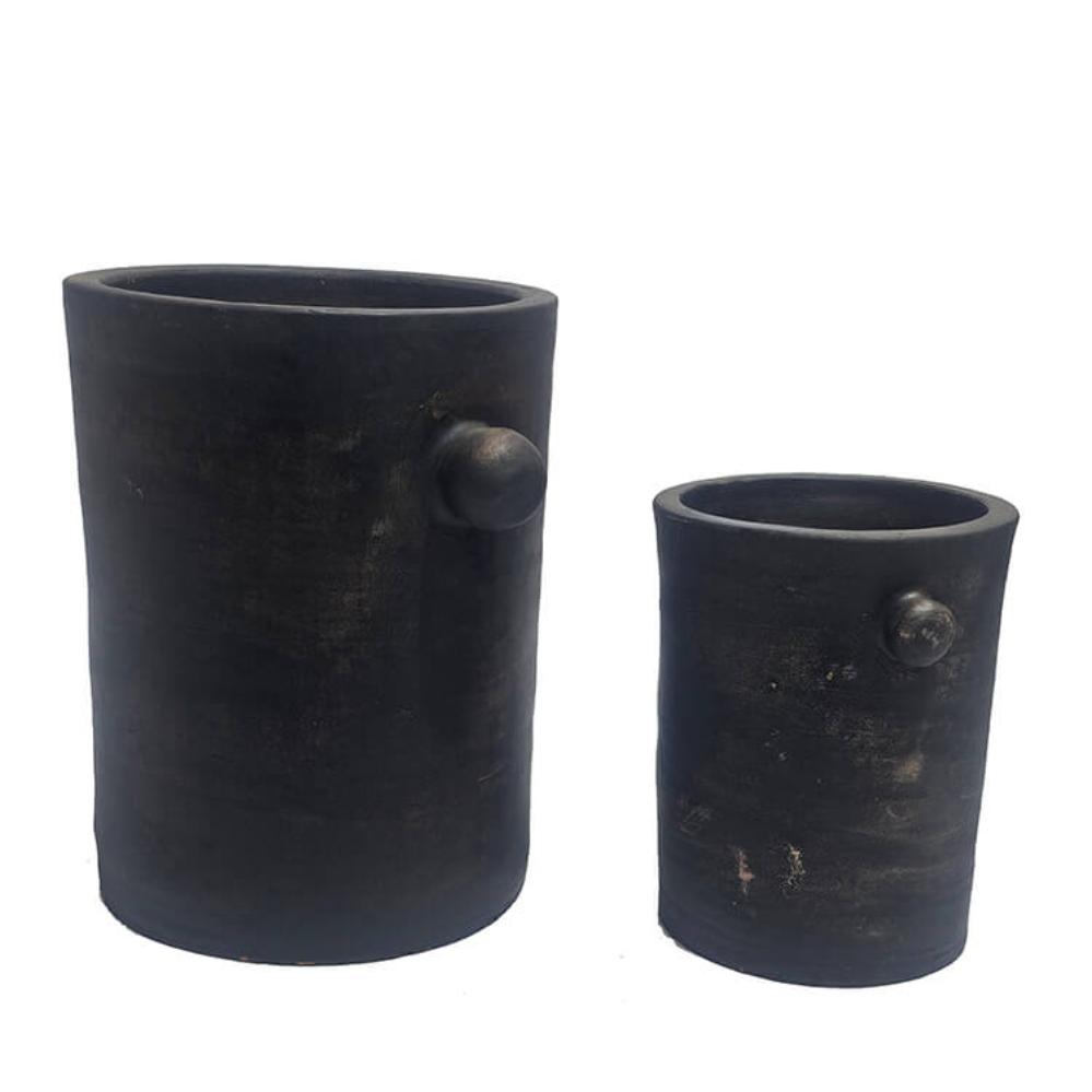This simple clay pot set is crafted in a rustic design with a dark finish, giving the pots an organic and masculine expression. The slim shape with the characteristic small handles on the sides adds a bit of edge to the classic pot design. Perfect as planters or as decorative elements in the living room, kitchen, or hallway. They can be placed together to create a harmonious look or used individually as eye-catching pieces. No matter where the pots are placed, they will add a raw and authentic atmosphere to your decor. If you use the pots for plants, we recommend to use at plastic insert, as the pots are not waterproof. The small pot measures: H:21 x W:20 x D:17 cm