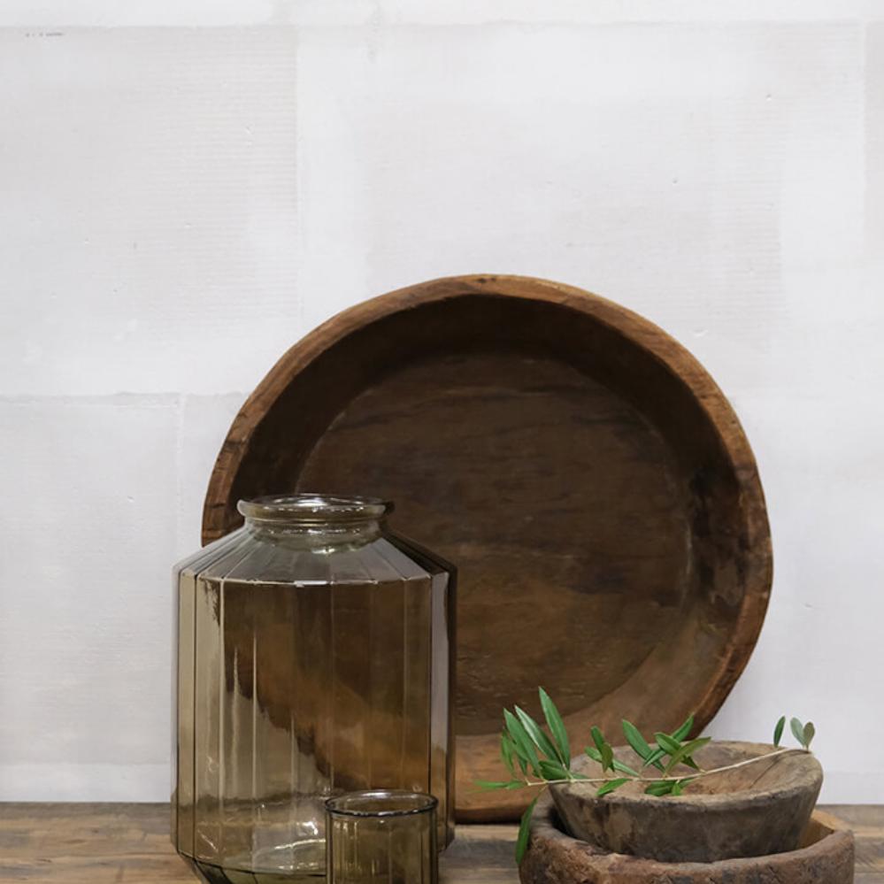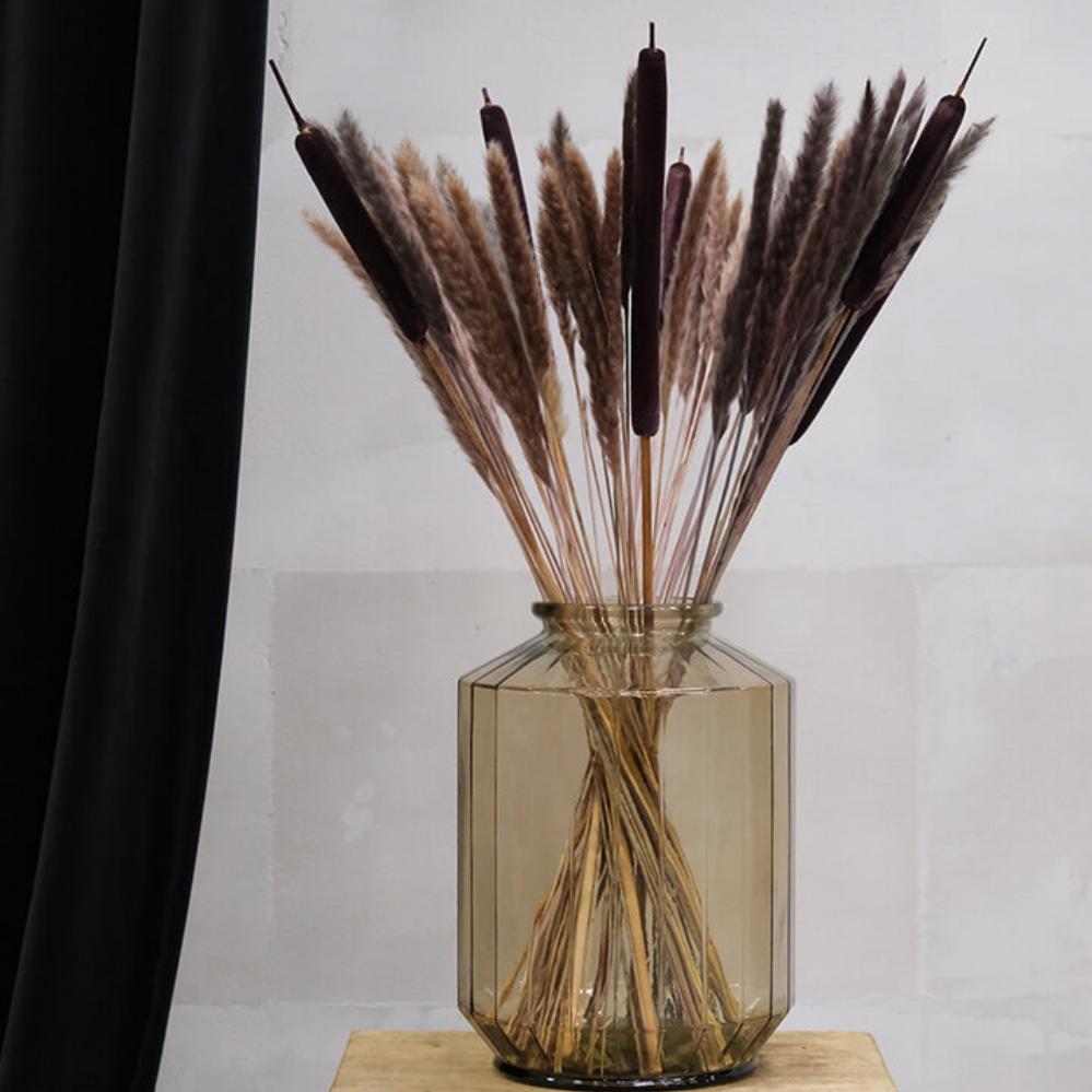 We love this beautiful smoke-coloured vase in an elegant angular design. You can decorate it with fresh flowers, branches from nature or dried flowers. The glass vase can also be used for a large pillar candle. The vase is 35 cm high and can therefore be used as a floor or table vase. With this beautiful glass vase, you can easily bring a little luxury into your decor. The vases are fine individually, as set or mixed with other shapes, sizes and materials. The glass vase is made of recycled glass, and therefore small bubbles and minor irregularities may occur in the glass.