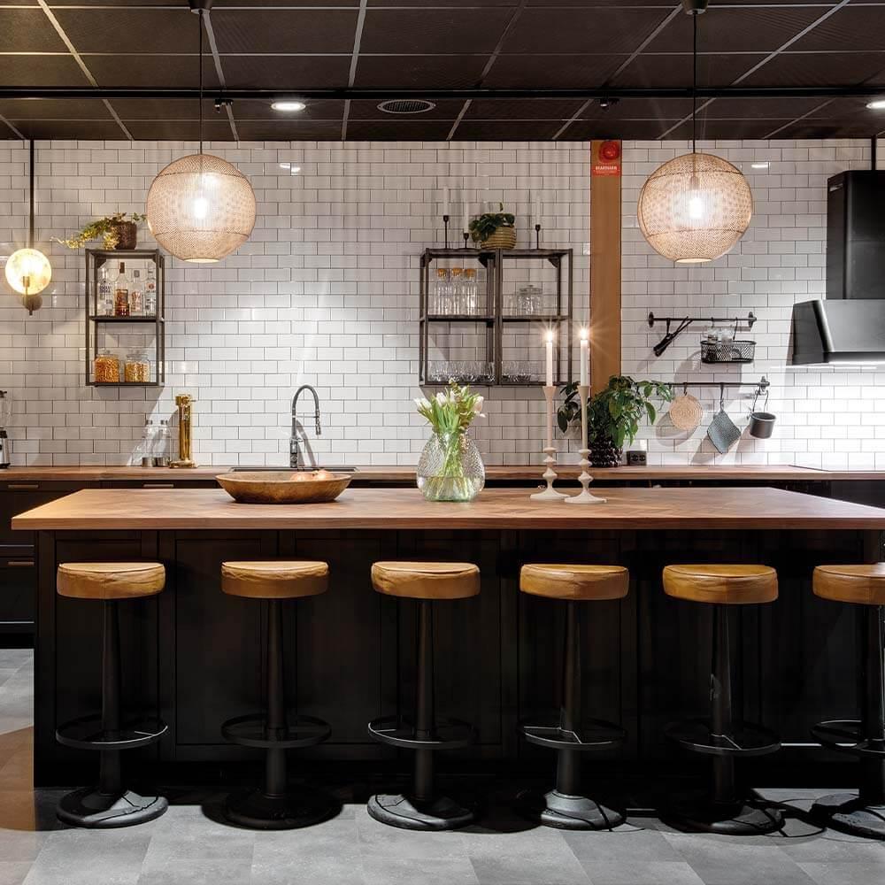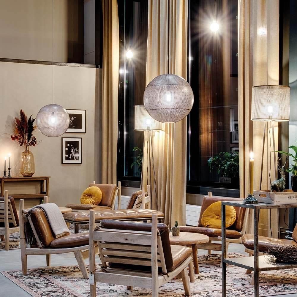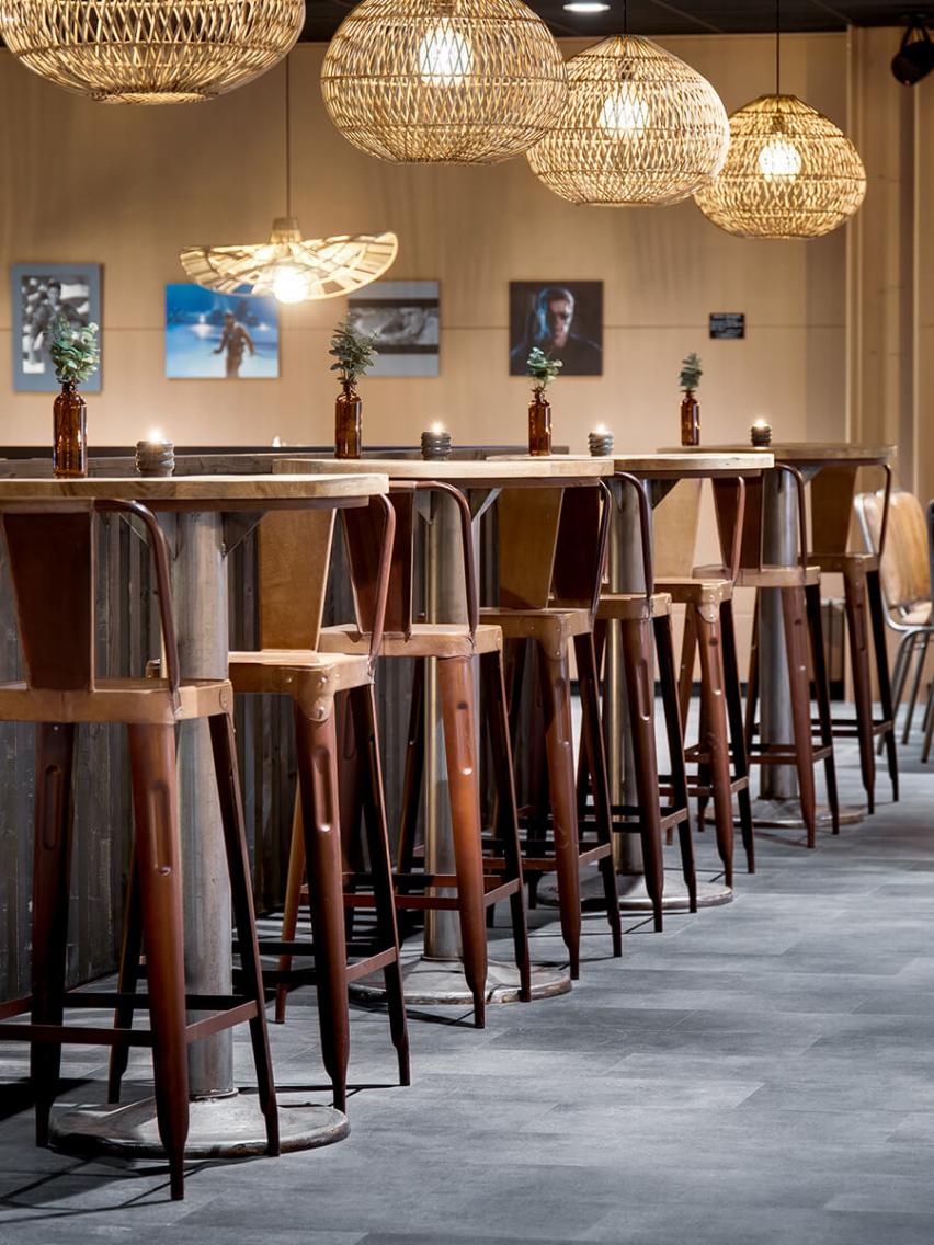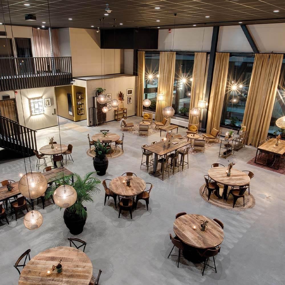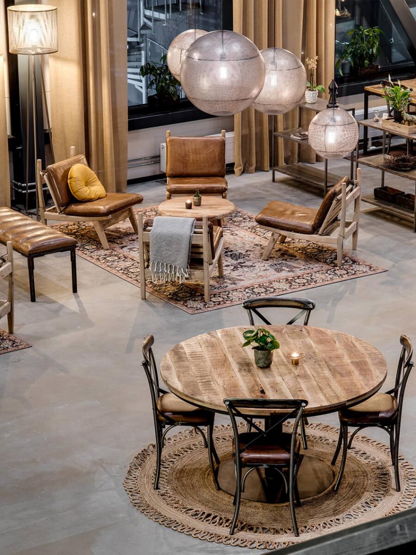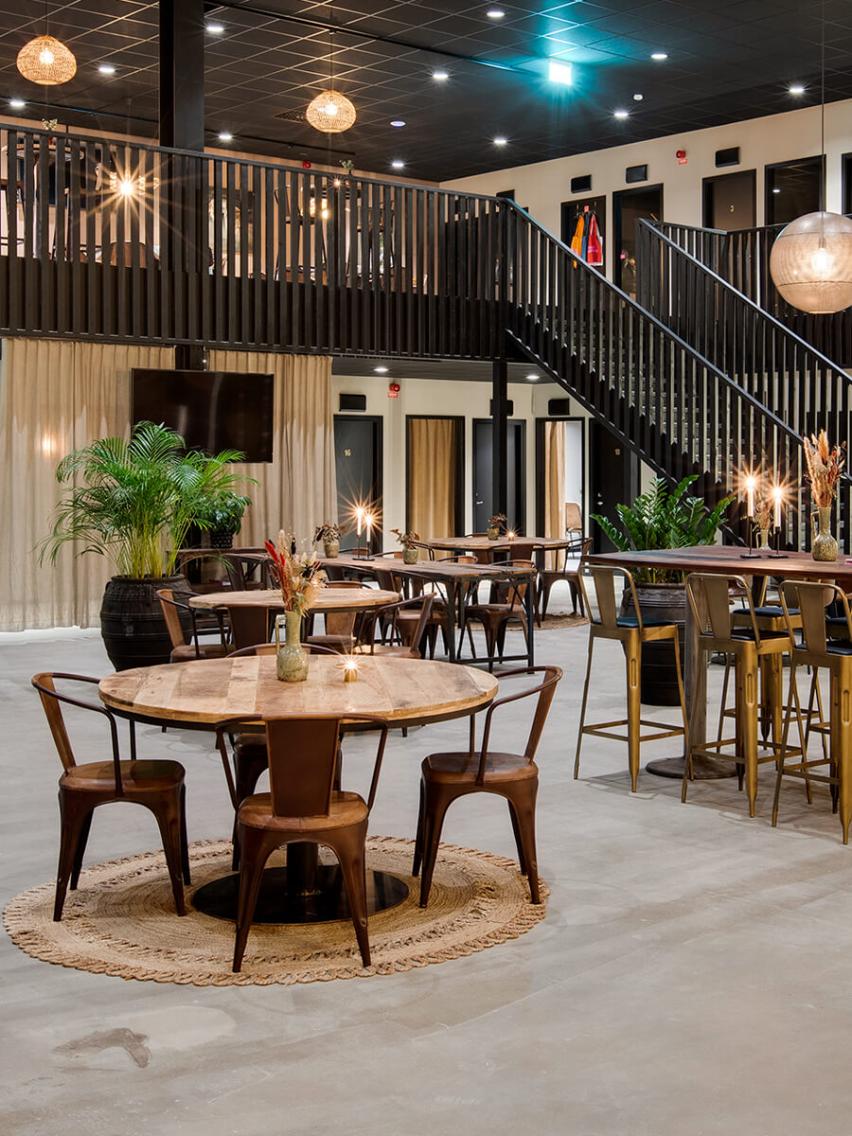 Jessica was responsible for the decor, and it was important to her that the whole project had a modern and rustic hotel feeling. She says passionately about the project: “In fact, I knew straight away that this interior design project should be based on Trademark Living furniture and interiors, as I had previously created cool and authentic interiors with this recycled vibe with great success.” She further explains: “I fell in love with the industrial perforated iron Moonlight lamps, so I knew I would build the downstairs facility using the lamps with the incredibly beautiful light. I imagined they would be very cool hanging high from the ceiling with the raw rustic round wooden tables underneath. Elsewhere in the room I chose the three-meter-long unique dining tables and in the lounge area I placed the comfortable and awesome James lounge chairs. I am very happy with the result. The facility is as exquisite, as I could have dreamed of”.