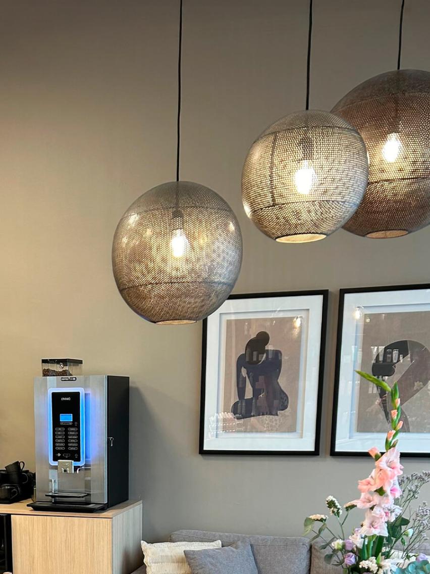 That’s why Kamilla chose the already mentioned cognac-coloured lounge chairs, lamps, and nesting tables in perforated iron, as well as matching cognac-coloured bar stools for the decoration of the waiting area.