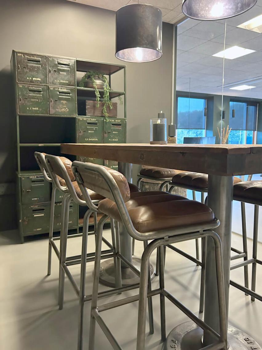 The meeting rooms feature either a round table for a more relaxed vibe, or a tall table where you can choose to stand. Dark furniture, a whisky barrel, and an old locker cabinet give the space a masculine man cave feel.