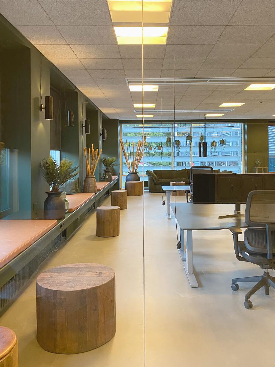 The offices are styled with sleek black desks, large monitors, and comfortable chairs. Cushions in the windowsills, a lounge area with a sofa, and lots of greenery in cool pots help make the space feel warm and welcoming.