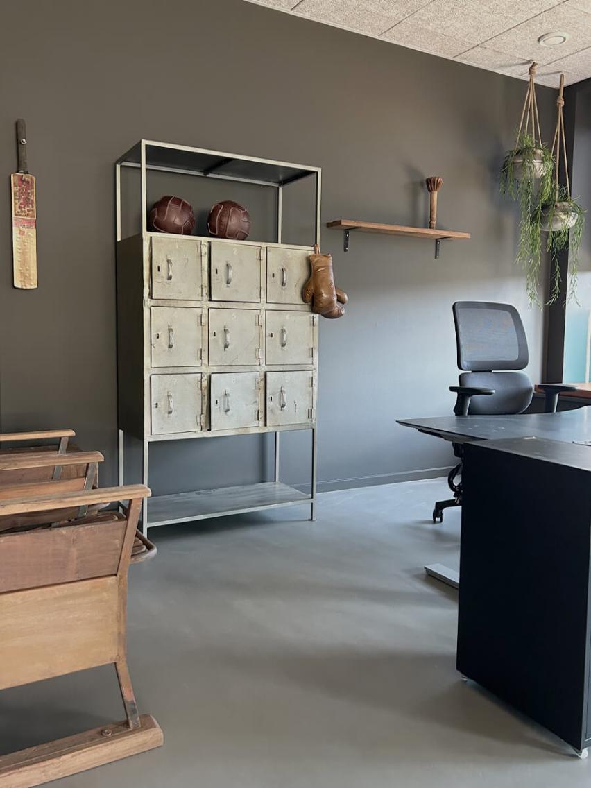 Rune’s office features a cool locker cabinet, an old cinema bench from India, and a few accessories from the Vintage Gym category, adding a raw, masculine and eye-catching element to the room.