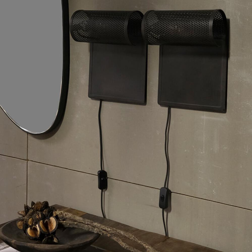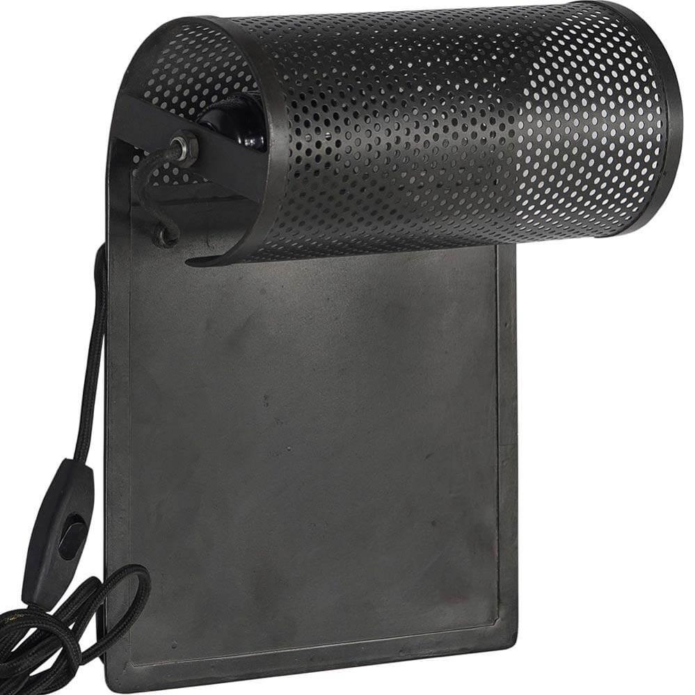 This wall lamp in dark iron combines function and charm. Its perforated shade creates a soft, diffused light that adds a cozy atmosphere to any room. The industrial design is highlighted by its robust construction and dark finish. The small flat surface doubles as a practical magnetic board, perfect for notes or decorative magnets. Ideal for the office, a hotel, or as ambient lighting in the living room. This lamp adds both functionality and character to your interior.