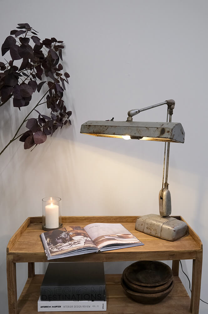 This table lamp has more character than most! With its rusty finish and worn look, it exudes authenticity and raw charm. The industrial design, featuring a heavy base and adjustable arm, makes it both functional and a true statement piece. The patina tells the story of a long life—perhaps it once sat on an old office desk or in a workshop, lighting up creative projects. Perfect as a desk lamp for those who love vintage and industrial design. Use it in your restaurant or shop to add a raw, upcycled touch to the space, or place it in your home office or living room to bring plenty of personality. It’s both decorative and practical—and quite a conversation starter!